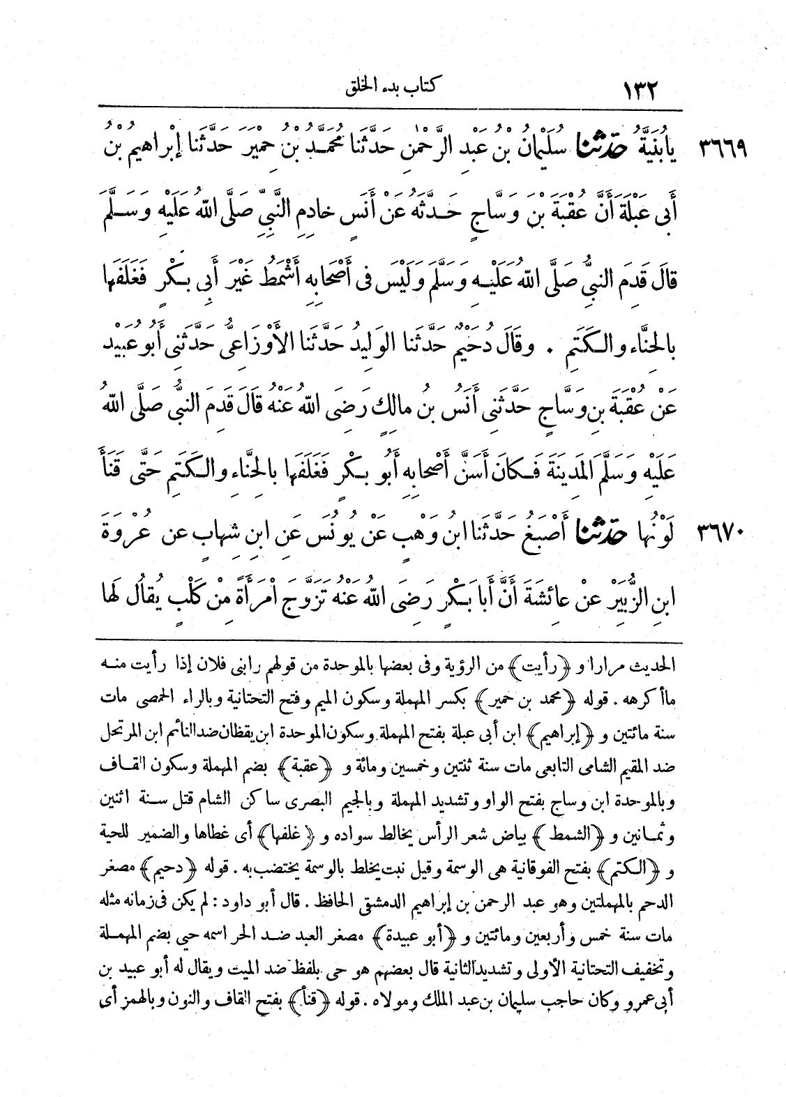 3669 - حَدَّثَنَا سُلَيْمَانُ بْنُ عَبْدِ الرَّحْمَنِ حَدَّثَنَا مُحَمَّدُ بْنُ حِمْيَرَ حَدَّثَنَا إِبْرَاهِيمُ بْنُ أَبِي عَبْلَةَ أَنَّ عُقْبَةَ بْنَ وَسَّاجٍ حَدَّثَهُ عَنْ أَنَسٍ خَادِمِ النَّبِيِّ صَلَّى اللَّهُ عَلَيْهِ وَسَلَّمَ قَالَ قَدِمَ النَّبِيُّ صَلَّى اللَّهُ عَلَيْهِ وَسَلَّمَ وَلَيْسَ فِي أَصْحَابِهِ أَشْمَطُ غَيْرَ أَبِي بَكْرٍ فَغَلَفَهَا بِالْحِنَّاءِ وَالْكَتَمِ وَقَالَ دُحَيْمٌ حَدَّثَنَا الْوَلِيدُ حَدَّثَنَا الْأَوْزَاعِيُّ حَدَّثَنِي أَبُو عُبَيْدٍ عَنْ عُقْبَةَ بْنِ وَسَّاجٍ حَدَّثَنِي أَنَسُ بْنُ مَالِكٍ رَضِيَ اللَّهُ عَنْهُ قَالَ قَدِمَ النَّبِيُّ صَلَّى اللَّهُ عَلَيْهِ وَسَلَّمَ الْمَدِينَةَ فَكَانَ أَسَنَّ أَصْحَابِهِ أَبُو بَكْرٍ فَغَلَفَهَا بِالْحِنَّاءِ وَالْكَتَمِ حَتَّى قَنَأَ لَوْنُهَا