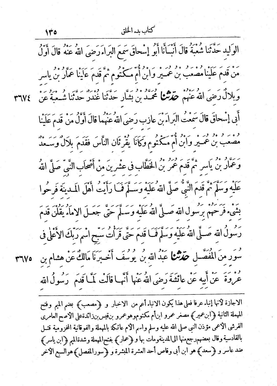 3674 - حَدَّثَنَا مُحَمَّدُ بْنُ بَشَّارٍ حَدَّثَنَا غُنْدَرٌ حَدَّثَنَا شُعْبَةُ عَنْ أَبِي إِسْحَاقَ قَالَ سَمِعْتُ الْبَرَاءَ بْنَ عَازِبٍ رَضِيَ اللَّهُ عَنْهُمَا قَالَ أَوَّلُ مَنْ قَدِمَ عَلَيْنَا مُصْعَبُ بْنُ عُمَيْرٍ وَابْنُ أُمِّ مَكْتُومٍ وَكَانَا يُقْرِئَانِ النَّاسَ فَقَدِمَ بِلَالٌ وَسَعْدٌ وَعَمَّارُ بْنُ يَاسِرٍ ثُمَّ قَدِمَ عُمَرُ بْنُ الْخَطَّابِ فِي عِشْرِينَ مِنْ أَصْحَابِ النَّبِيِّ صَلَّى اللَّهُ عَلَيْهِ وَسَلَّمَ ثُمَّ قَدِمَ النَّبِيُّ صَلَّى اللَّهُ عَلَيْهِ وَسَلَّمَ فَمَا رَأَيْتُ أَهْلَ الْمَدِينَةِ فَرِحُوا بِشَيْءٍ فَرَحَهُمْ بِرَسُولِ اللَّهِ صَلَّى اللَّهُ عَلَيْهِ وَسَلَّمَ حَتَّى جَعَلَ الْإِمَاءُ يَقُلْنَ قَدِمَ رَسُولُ اللَّهِ صَلَّى اللَّهُ عَلَيْهِ وَسَلَّمَ فَمَا قَدِمَ حَتَّى قَرَاتُ سَبِّحْ اسْمَ رَبِّكَ الْأَعْلَى فِي سُوَرٍ مِنْ الْمُفَصَّلِ