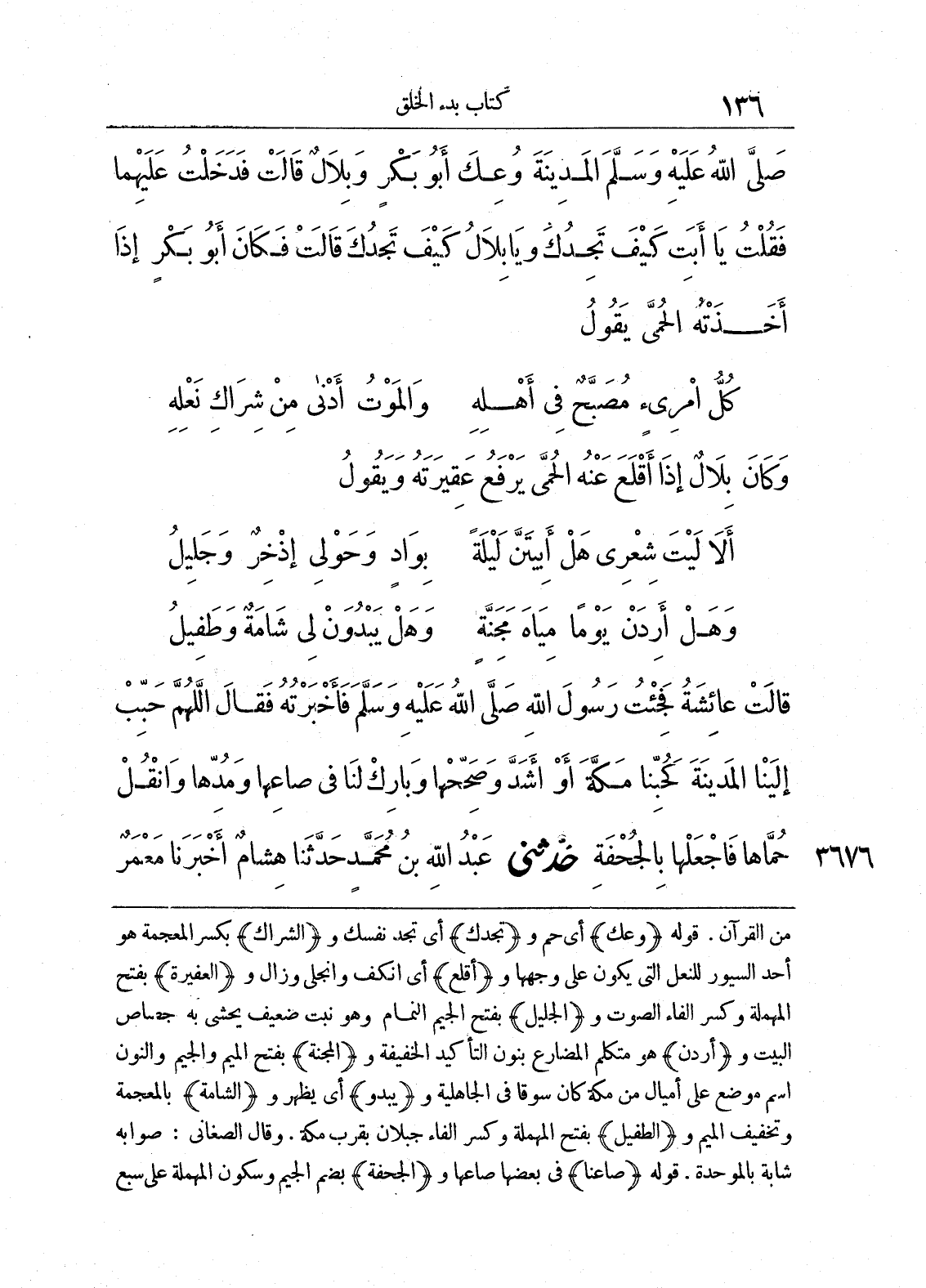 من القرآن. قوله) وعك (أي حم و) تجدك (أي تجد نفسك. و) الشراك (بكسر المعجمة هو أحد السيور للنعل التي يكون على وجهها و) أقلع (أي أنكف وانجلى وزال و) العفيرة (بفتح المهملة وكسر الفاء الصوت و) الجليل (بفتح الجيم النمام وهو نبت ضعيف يحشى به جصاص البيت و (أردن) هو متكلم المضارع بنون التأكيد الخفيفة و (المجنة) بفتح الميم والجيم والنون اسم موضع على أميال من مكة كان سوقا في الجاهلية و (يبدو) أي يظهر و (الشامة) بالمعجمة وتخفيف الميم و (الطفيل) بفتح المهملة وكسر الفاء جبلان بقرب مكة. وقال الصغاني: صوابه شابة بالموحدة. قوله (صاعنا) في بعضها صاعها و (الجحفة) بضم الجيم وسكون المهملة على سبع