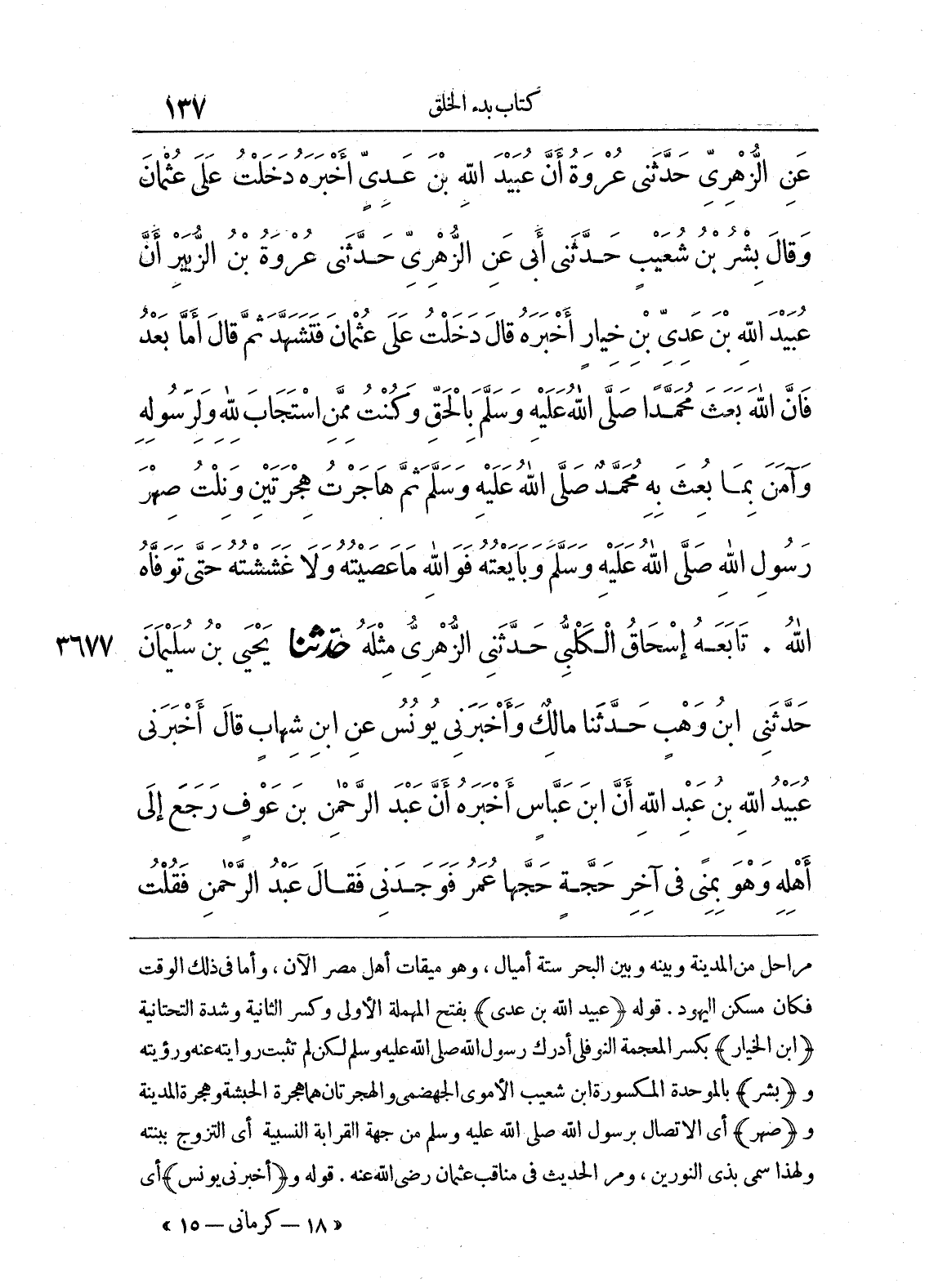 عَنْ الزُّهْرِيِّ حَدَّثَنِي عُرْوَةُ بْنُ الزُّبَيْرِ أَنَّ عُبَيْدَ اللَّهِ بْنَ عَدِيِّ بْنِ الْخِيَارِ أَخْبَرَهُ دَخَلْتُ عَلَى عُثْمَانَ وَقَالَ بِشْرُ بْنُ شُعَيْبٍ حَدَّثَنِي أَبِي عَنْ الزُّهْرِيِّ حَدَّثَنِي عُرْوَةُ بْنُ الزُّبَيْرِ أَنَّ عُبَيْدَ اللَّهِ بْنَ عَدِيِّ بْنِ خِيَارٍ أَخْبَرَهُ قَالَ دَخَلْتُ عَلَى عُثْمَانَ فَتَشَهَّدَ ثُمَّ قَالَ أَمَّا بَعْدُ فَإِنَّ اللَّهَ بَعَثَ مُحَمَّدًا صَلَّى اللَّهُ عَلَيْهِ وَسَلَّمَ بِالْحَقِّ وَكُنْتُ مِمَّنْ اسْتَجَابَ لِلَّهِ وَلِرَسُولِهِ وَآمَنَ بِمَا بُعِثَ بِهِ مُحَمَّدٌ صَلَّى اللَّهُ عَلَيْهِ وَسَلَّمَ ثُمَّ هَاجَرْتُ هِجْرَتَيْنِ وَنِلْتُ صِهْرَ رَسُولِ اللَّهِ صَلَّى اللَّهُ عَلَيْهِ وَسَلَّمَ وَبَايَعْتُهُ فَوَاللَّهِ مَا عَصَيْتُهُ وَلَا غَشَشْتُهُ حَتَّى تَوَفَّاهُ اللَّهُ تَابَعَهُ إِسْحَاقُ الْكَلْبِيُّ حَدَّثَنِي الزُّهْرِيُّ مِثْلَهُ
