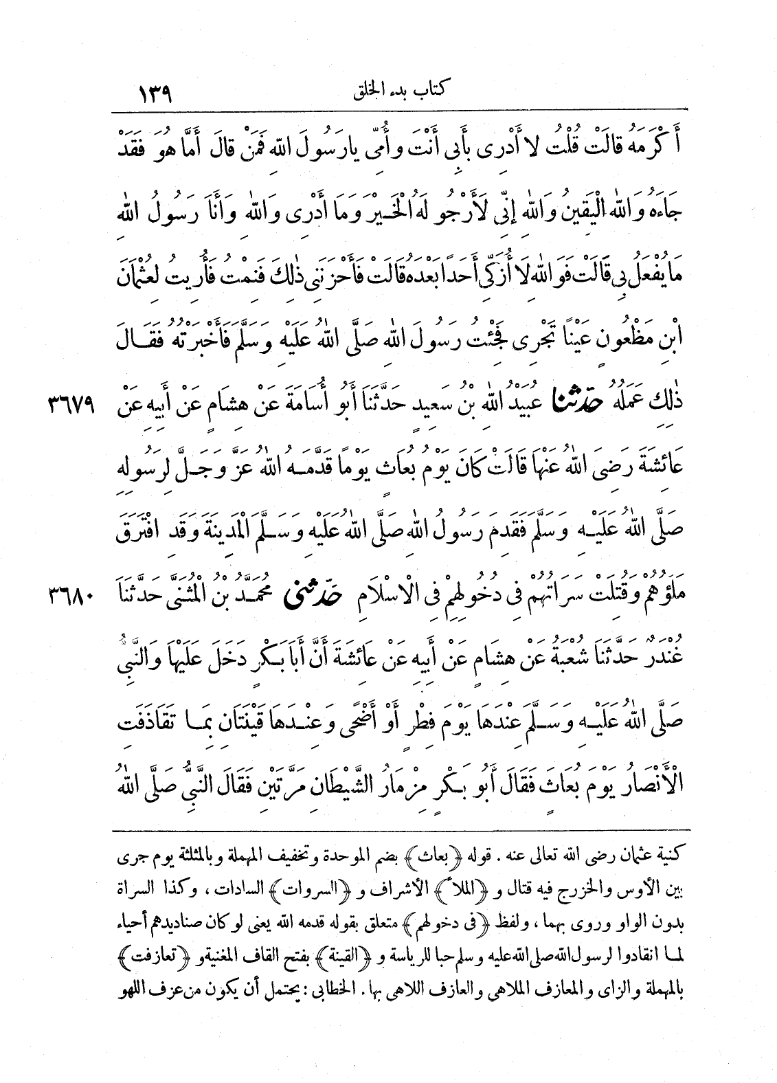 3679 - حَدَّثَنَا عُبَيْدُ اللَّهِ بْنُ سَعِيدٍ حَدَّثَنَا أَبُو أُسَامَةَ عَنْ هِشَامٍ عَنْ أَبِيهِ عَنْ عَائِشَةَ رَضِيَ اللَّهُ عَنْهَا قَالَتْ كَانَ يَوْمُ بُعَاثٍ يَوْمًا قَدَّمَهُ اللَّهُ عَزَّ وَجَلَّ لِرَسُولِهِ صَلَّى اللَّهُ عَلَيْهِ وَسَلَّمَ فَقَدِمَ رَسُولُ اللَّهِ صَلَّى اللَّهُ عَلَيْهِ وَسَلَّمَ الْمَدِينَةَ وَقَدْ افْتَرَقَ مَلَؤُهُمْ وَقُتِلَتْ سَرَاتُهُمْ فِي دُخُولِهِمْ فِي الْإِسْلَامِ