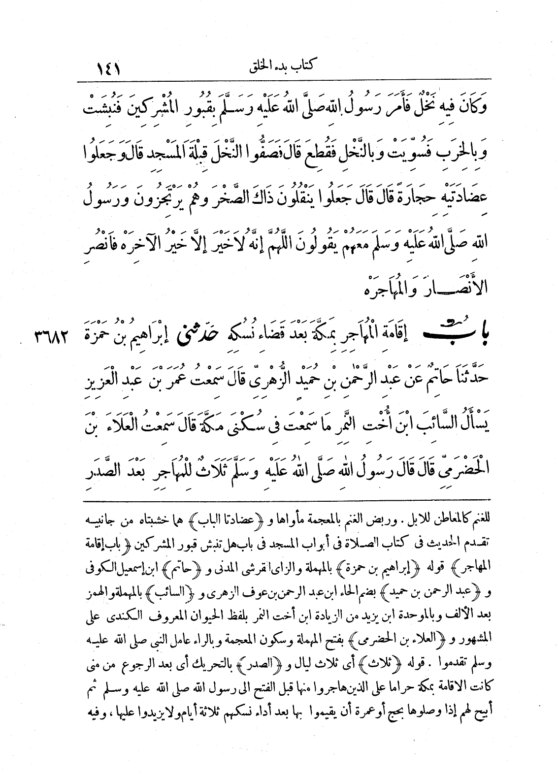 3682 - حَدَّثَنِي إِبْرَاهِيمُ بْنُ حَمْزَةَ حَدَّثَنَا حَاتِمٌ عَنْ عَبْدِ الرَّحْمَنِ بْنِ حُمَيْدٍ الزُّهْرِيِّ قَالَ سَمِعْتُ عُمَرَ بْنَ عَبْدِ الْعَزِيزِ يَسْأَلُ السَّائِبَ ابْنَ أُخْتِ الْنَّمِرِ مَا سَمِعْتَ فِي سُكْنَى مَكَّةَ قَالَ سَمِعْتُ الْعَلَاءَ بْنَ الْحَضْرَمِيِّ قَالَ قَالَ رَسُولُ اللَّهِ صَلَّى اللَّهُ عَلَيْهِ وَسَلَّمَ ثَلَاثٌ لِلْمُهَاجِرِ بَعْدَ الصَّدَرِ
