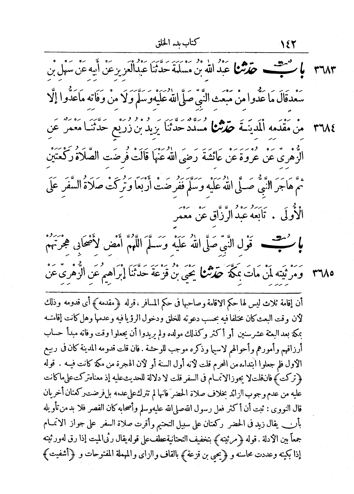 أن إقامة ثلاث ليس لها حكم الإقامة وصاحبها في حكم المسافر، قوله (مقدمة) أي قدومه وذلك لأن وقت البعث كان مختلفا فيه بحسب دعوته للخلق ودخول الرؤيا فيه وعدمها وهل كانت إقامته بمكة بعد بعد البعثة عشر سنين أو أكثر وكذلك مولده ولم يريدوا أن يجعلوا وقت وفاته مبدأ حساب أرزاقهم وأمورهم وأحوالهم لا سيما وذكره موجب للوحشة. فإن قلت قدومه المدينة كان في ربيع الأول فلم جعلوا ابتداه من المحرم قلت لأنه أول السنة أو لأن الهجرة من مكة كانت فيه. قوله (تركت) فإن قلت لا يجوز الإتمام في السفر قلت لا دلالة للحديث عليه إذ معناه تركت على ما كانت عليه من عدم وجوب الزائد بخلاف صلاة الحضر فإنها لم تترك على عدمه بل فرضت ركعتان أخريان قال النووي: ثبت أن أكثر فعل رسول الله صلى الله عليه وسلم وأصحابه كان القصر فلا بد من تأويله بأن يقال زيد في الحضر ركعتان على سبيل التحتيم وأقرت صلاة السفر على جواز الإتمام جمعا بين الأدلة. قوله (مرثيته) بتخفيف التحتانية عطف على قوله يقال رثى الميت إذا رق له ورثيته إذا بكيته وعددت محاسنه و (يحي بن قزعة) بالقاف والزاي والمهملة المفتوحات و (أشفيت)