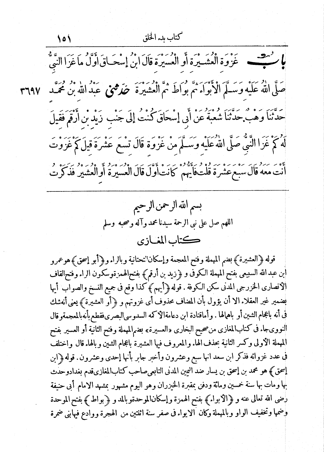 قوله (العشيرة) بضم المهملة وفتح المعجمة وإسكان التحتانية وبالراء و (أبو إسحق) هو عمرو ابن عبد الله السبيعي بفتح المهملة الكوفي و (زيد بن أرقم) بفتح الهمزة وسكون الراء وفتح القاف الأنصاري الخزرجي المدني سكن الكوفة. قوله (أيهم) كذا وقع في جميع النسخ والصواب أيها بضمير غير العقلاء الا أن يؤول بأن المضاف محذوف أي غزوتهم و (أو العشيرة) يعني أنه شك في أنه بإعجام الشين أو بإهمالها. وأما قتادة ابن دعامة الأكمة السدوسي البصري فقطع بأنه بالمعجمة وقال النووي جاء في كتاب المغازي من صحيح البخاري (العسيرة) بضم المهملة وفتح الثانية أو العسير بفتح المهملة الأولى وكسر الثانية بحذف الهاء والمعروف فيها العشيرة باعجام الشين وبالهاء قال واختلف في عدد غزواته فذكر ابن سعد إنها سبع وعشرون وأخبر جابر بأنها إحدى وعشرون. قوله (ابن إسحق) هو محمد بن إسحق بن يسار ضد اليمين المدني التابعي صاحب كتاب المغازي قدم بغداد وحدث بها ومات بها سنة خمسن ومائة ودفن بمقبرة الخيزران وهو اليوم مشهور بمشهد الإمام أبي حنيفة رضي الله تعالى عنه و (الأبواء) بفتح الهمزة وإسكان الموحدة وبالمد و (بواط) بفتح الموحدة وضمها وتخفيف الواو وبالمهملة وكان الإيواء في صفر سنة اثنتين من الهجرة ووداع فيها بني ضمرة.