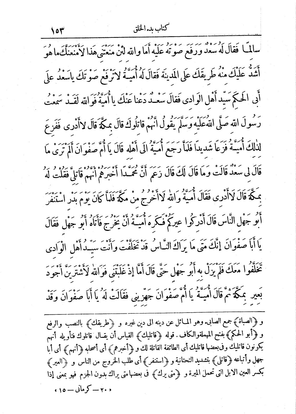 سَالِمًا فَقَالَ لَهُ سَعْدٌ وَرَفَعَ صَوْتَهُ عَلَيْهِ أَمَا وَاللَّهِ لَئِنْ مَنَعْتَنِي هَذَا لَأَمْنَعَنَّكَ مَا هُوَ أَشَدُّ عَلَيْكَ مِنْهُ طَرِيقَكَ عَلَى الْمَدِينَةِ فَقَالَ لَهُ أُمَيَّةُ لَا تَرْفَعْ صَوْتَكَ يَا سَعْدُ عَلَى أَبِي الْحَكَمِ سَيِّدِ أَهْلِ الْوَادِي فَقَالَ سَعْدٌ دَعْنَا عَنْكَ يَا أُمَيَّةُ فَوَاللَّهِ لَقَدْ سَمِعْتُ رَسُولَ اللَّهِ صَلَّى اللَّهُ عَلَيْهِ وَسَلَّمَ يَقُولُ إِنَّهُمْ قَاتِلُوكَ قَالَ بِمَكَّةَ قَالَ لَا أَدْرِي فَفَزِعَ لِذَلِكَ أُمَيَّةُ فَزَعًا شَدِيدًا فَلَمَّا رَجَعَ أُمَيَّةُ إِلَى أَهْلِهِ قَالَ يَا أُمَّ صَفْوَانَ أَلَمْ تَرَيْ مَا قَالَ لِي سَعْدٌ قَالَتْ وَمَا قَالَ لَكَ قَالَ زَعَمَ أَنَّ مُحَمَّدًا أَخْبَرَهُمْ أَنَّهُمْ قَاتِلِيَّ فَقُلْتُ لَهُ بِمَكَّةَ قَالَ لَا أَدْرِي فَقَالَ أُمَيَّةُ وَاللَّهِ لَا أَخْرُجُ مِنْ مَكَّةَ فَلَمَّا كَانَ يَوْمُ بَدْرٍ اسْتَنْفَرَ أَبُو جَهْلٍ النَّاسَ قَالَ أَدْرِكُوا عِيرَكُمْ فَكَرِهَ أُمَيَّةُ أَنْ يَخْرُجَ فَأَتَاهُ أَبُو جَهْلٍ فَقَالَ يَا أَبَا صَفْوَانَ إِنَّكَ مَتَى مَا يَرَاكَ النَّاسُ قَدْ تَخَلَّفْتَ وَأَنْتَ سَيِّدُ أَهْلِ الْوَادِي تَخَلَّفُوا مَعَكَ فَلَمْ يَزَلْ بِهِ أَبُو جَهْلٍ حَتَّى قَالَ أَمَّا إِذْ غَلَبْتَنِي فَوَاللَّهِ لَأَشْتَرِيَنَّ أَجْوَدَ بَعِيرٍ بِمَكَّةَ ثُمَّ قَالَ أُمَيَّةُ يَا أُمَّ صَفْوَانَ جَهِّزِينِي فَقَالَتْ لَهُ يَا أَبَا صَفْوَانَ وَقَدْ