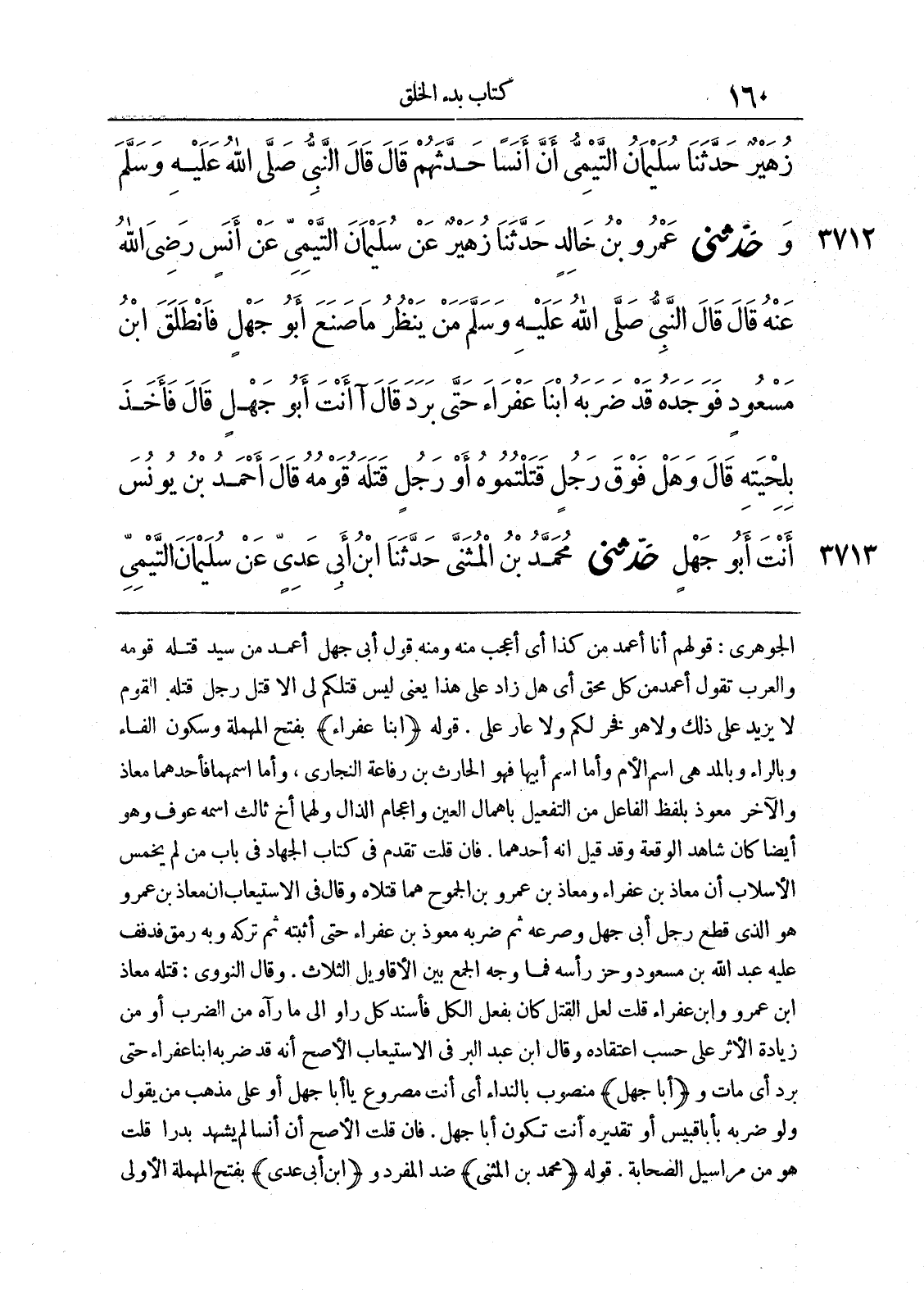 3712 - وحَدَّثَنِي عَمْرُو بْنُ خَالِدٍ حَدَّثَنَا زُهَيْرٌ عَنْ سُلَيْمَانَ التَّيْمِيِّ عَنْ أَنَسٍ رَضِيَ اللَّهُ عَنْهُ قَالَ قَالَ النَّبِيُّ صَلَّى اللَّهُ عَلَيْهِ وَسَلَّمَ مَنْ يَنْظُرُ مَا صَنَعَ أَبُو جَهْلٍ فَانْطَلَقَ ابْنُ مَسْعُودٍ فَوَجَدَهُ قَدْ ضَرَبَهُ ابْنَا عَفْرَاءَ حَتَّى بَرَدَ قَالَ أَأَنْتَ أَبُو جَهْلٍ قَالَ فَأَخَذَ بِلِحْيَتِهِ قَالَ وَهَلْ فَوْقَ رَجُلٍ قَتَلْتُمُوهُ أَوْ رَجُلٍ قَتَلَهُ قَوْمُهُ قَالَ أَحْمَدُ بْنُ يُونُسَ أَنْتَ أَبُو جَهْلٍ