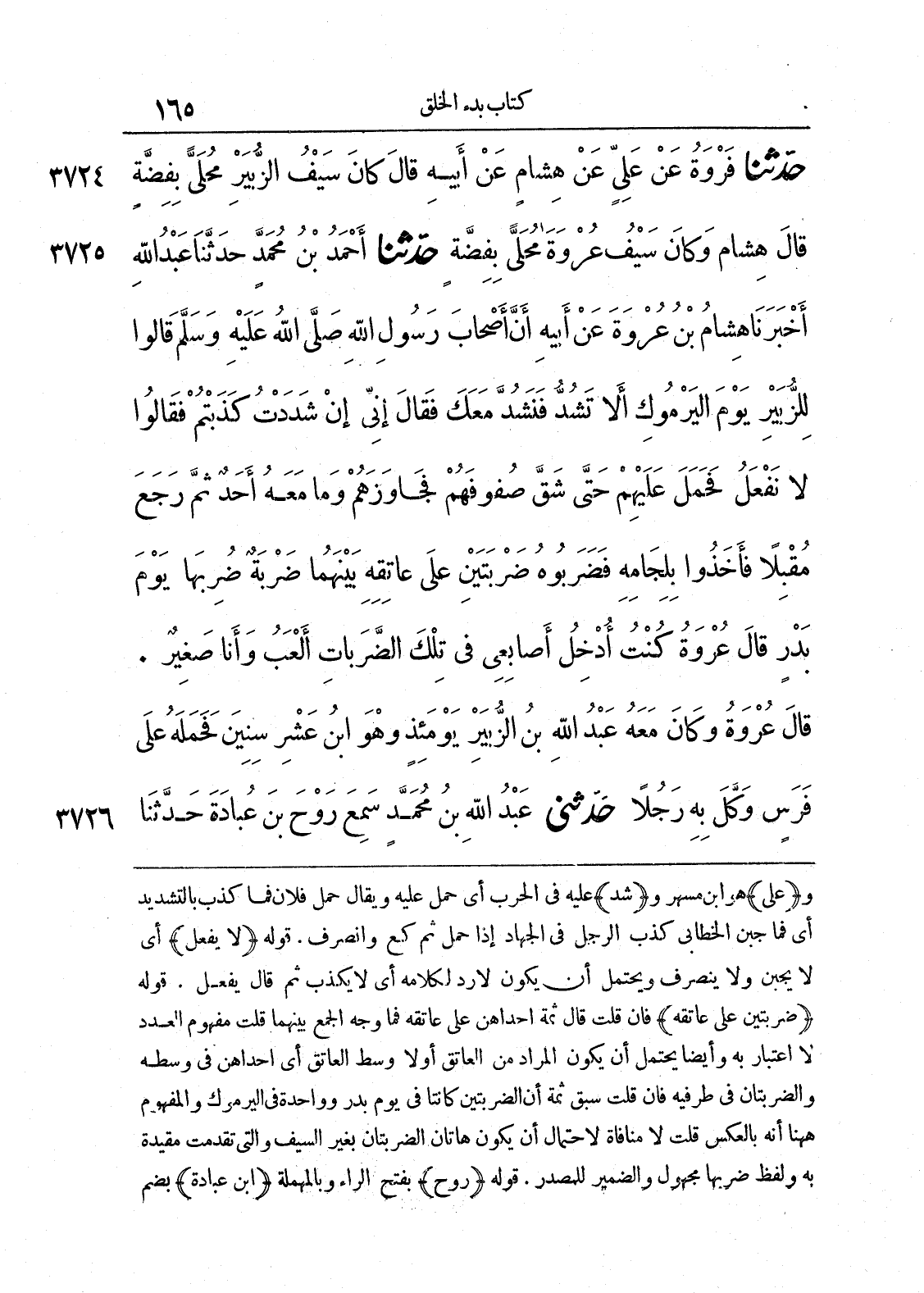 3724 - حَدَّثَنَا فَرْوَةُ حَدَّثَنَا عَلِيٌّ عَنْ هِشَامٍ عَنْ أَبِيهِ قَالَ كَانَ سَيْفُ الزُّبَيْرِ بْنِ الْعَوَّامِ مُحَلًّى بِفِضَّةٍ قَالَ هِشَامٌ وَكَانَ سَيْفُ عُرْوَةَ مُحَلًّى بِفِضَّةٍ