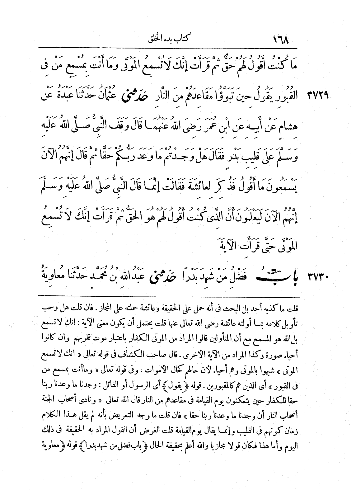 قلت ما كذبه أحد بل البحث في أنه حمل على الحقيقة وعائشة حملته على المجاز. فإن قلت هل وجب تأويل كلامه بما أولته عائشة رضي الله تعالى عنها قلت يحتمل أن يكون معنى الآية: انك لا تسمع بل الله هو المسمع مع أن المتأولين قالوا المراد من الموتى الكفار باعتبار موت قلوبهم وإن كانوا أحياء صورة وكذا المراد من الآية الأخرى. قال صاحب الكشاف في قوله تعالى {وما أنت بمسمع من في االقبور} أي الذين هم كالمقبورين. قوله (يقول) أي الرسول أو القائل: وجدنا ما وعدنا ربنا حقا للكفار حين يتمكون يوم القيامة في مقاعدهم من النار فإن الله تعالى {ونادى أصحاب الجنة أصحاب النار أن وجدنا ما وعدنا رنا حقا} فإن قلت ما وجه التعريض بأنه لم يقل هذا الكلام زمان كونهم في القليب وإنما يقال يوم القيامة قلت الغرض أن القول المراد به الحقيقة في ذلك اليوم وأما هذا فكان قولا مجازيا والله أعلم بحقيقة الحال (باب فضل من شهد بدرا) قوله (معاوية