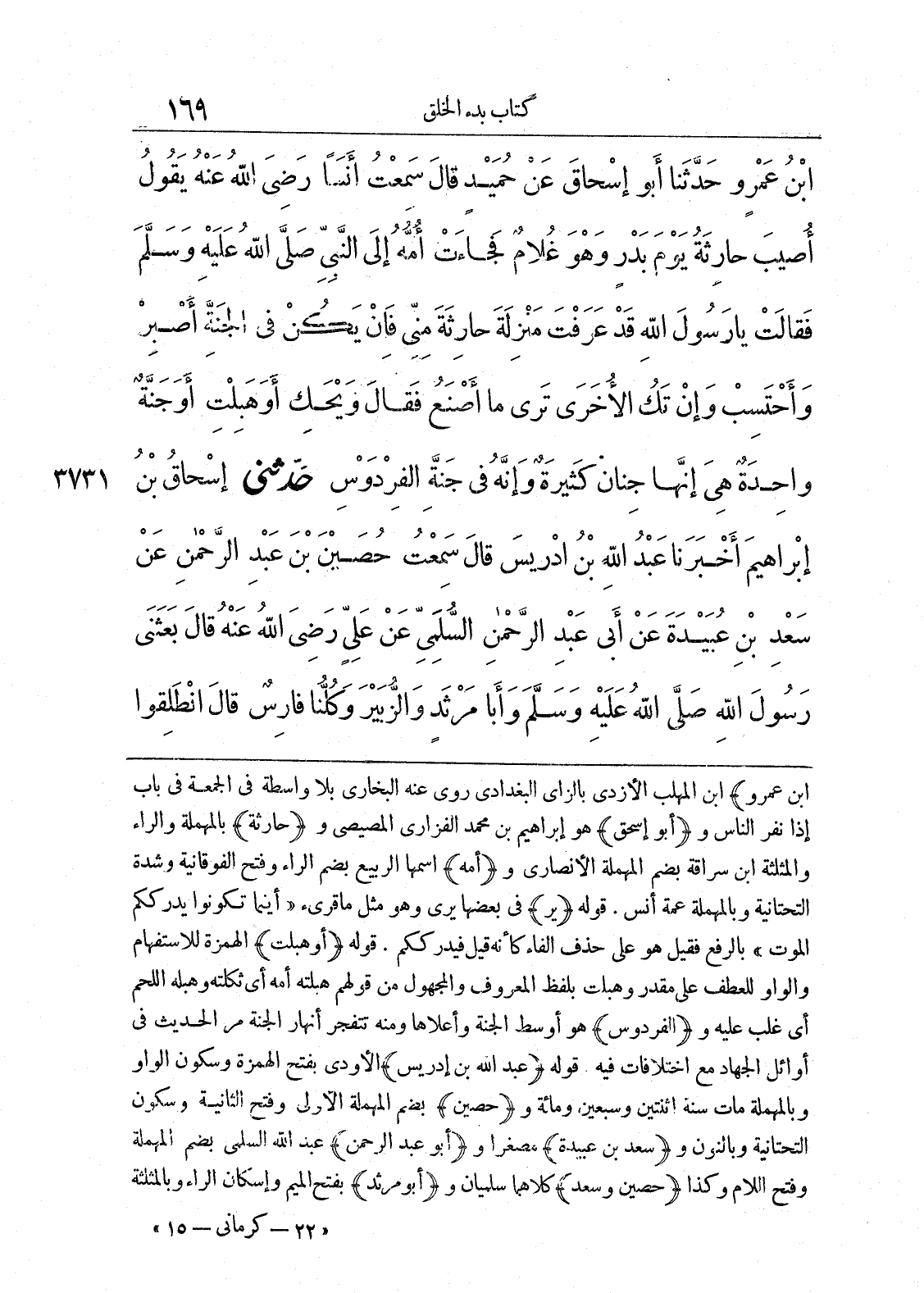 ابن عمرو) ابن المهلب الأزدي بالزاي البغدادي روى عنه البخاري بلا واسطة في الجمعة في باب إذا نفر الناس و (أبو إسحق) هو إبراهيم بن محمد الفزاري المصيصي و (حارثة) بالمهملة والراء والمثلثة ابن سراقة بضم المهملة الأنصاري و (أمه) اسمها الربيع بضم الراء وفتح الفوقانية وشدة التحتانية وبالمهملة عمة أنس. قوله (ير) في بعضها يرى وهو مثل ما قرئ {أينما تكونوا يدرككم الموت} بالرفع فقيل هو على حذف الفاء كأنه قيل فيدرككم. قوله (أوهبلت) الهمزة للاستفهام والواو للعطف على مقدر وهبلت بلفظ المعروف والمجهول من قولهم هبلته أمه أي ثكلته وهبله اللحم أي غلب عليه و (الفردوس) هو أوسط الجنة وأعلاها ومنه تتفجر أنهار الجنة مر الحديث في أوائل الجهاد مع اختلافات فيه. قوله (عبد الله بن إدريس) الأودي بفتح الهمزة وسكون الواو وبالمهملة مات سنة اثنتين وسبعين ومائة و (حصين) بضم المهملة الأولى وفتح الثانية وسكون التحتانية وبالنون و (سعد بن عبيدة) مصغرا و (أبو عبد الرحمن) عبد الله السلمي بضم المهملة وفتح اللام وكذا (حصين وسعد) كلاهما سليمان و (أبو مرثد) بفتح الميم وإسكان الراء وبالمثلثة