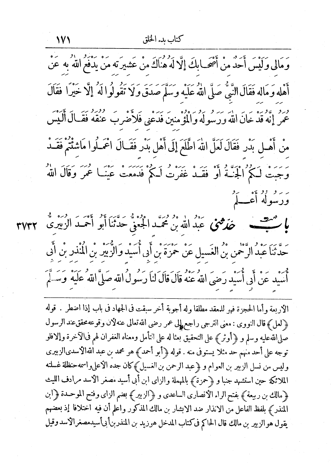 الأربعة وأما الحجزة فهو للمعقد مطلقا وله أجوبة أخر سبقت في الجهاد في باب إذا اضطر. قوله (لعل) قال النووي: معنى الترجي راجع إلى عمر رضي الله تعالى عنه لأن وقوعه محقق عند الرسول صلى الله عليه وسلم و (أوثر) على التحقيق بعثا له على التأمل ومعناه الغفران لهم في الآخرة وإلا فلو توجه على أحد منهم حد مثلا يستوفى منه. قوله (أبو أحمد) هو محمد بن عبد الله الأسدي الزبيري وليس من نسل الزبير بن العوام و (عبد الرحمن بن الغسيل) كان جده الأعلى واسمه حنظلة غسلته الملائكة حين استشهد جنبا و (حمزة) بالمهملة والزاي ابن أبي أسيد مصغر الأسد مرادف الليث (مالك بن ربيعة) بفتح الراء الأنصاري الساعدي و (الزبير) بضم الزاي وفتح الموحدة (ابن المنذر) بلفظ الفاعل من الإنذار ضد الإبشار بن مالك المذكور واعلم أن فيه اختلافا إذ بعضهم يقول هو الزبير بن مالك قال الحاكم في كتاب المدخل هو زيد بن المنذر بن أبي أسيد مصغر الأسد وقيل