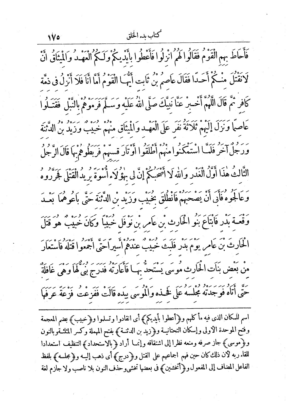 فَأَحَاطَ بِهِمْ الْقَوْمُ فَقَالُوا لَهُمْ انْزِلُوا فَأَعْطُوا بِأَيْدِيكُمْ وَلَكُمْ الْعَهْدُ وَالْمِيثَاقُ أَنْ لَا نَقْتُلَ مِنْكُمْ أَحَدًا فَقَالَ عَاصِمُ بْنُ ثَابِتٍ أَيُّهَا الْقَوْمُ أَمَّا أَنَا فَلَا أَنْزِلُ فِي ذِمَّةِ كَافِرٍ ثُمَّ قَالَ اللَّهُمَّ أَخْبِرْ عَنَّا نَبِيَّكَ صَلَّى اللَّهُ عَلَيْهِ وَسَلَّمَ فَرَمَوْهُمْ بِالنَّبْلِ فَقَتَلُوا عَاصِمًا وَنَزَلَ إِلَيْهِمْ ثَلَاثَةُ نَفَرٍ عَلَى الْعَهْدِ وَالْمِيثَاقِ مِنْهُمْ خُبَيْبٌ وَزَيْدُ بْنُ الدَّثِنَةِ وَرَجُلٌ آخَرُ فَلَمَّا اسْتَمْكَنُوا مِنْهُمْ أَطْلَقُوا أَوْتَارَ قِسِيِّهِمْ فَرَبَطُوهُمْ بِهَا قَالَ الرَّجُلُ الثَّالِثُ هَذَا أَوَّلُ الْغَدْرِ وَاللَّهِ لَا أَصْحَبُكُمْ إِنَّ لِي بِهَؤُلَاءِ أُسْوَةً يُرِيدُ الْقَتْلَى فَجَرَّرُوهُ وَعَالَجُوهُ فَأَبَى أَنْ يَصْحَبَهُمْ فَانْطُلِقَ بِخُبَيْبٍ وَزَيْدِ بْنِ الدَّثِنَةِ حَتَّى بَاعُوهُمَا بَعْدَ وَقْعَةِ بَدْرٍ فَابْتَاعَ بَنُو الْحَارِثِ بْنِ عَامِرِ بْنِ نَوْفَلٍ خُبَيْبًا وَكَانَ خُبَيْبٌ هُوَ قَتَلَ الْحَارِثَ بْنَ عَامِرٍ يَوْمَ بَدْرٍ فَلَبِثَ خُبَيْبٌ عِنْدَهُمْ أَسِيرًا حَتَّى أَجْمَعُوا قَتْلَهُ فَاسْتَعَارَ مِنْ بَعْضِ بَنَاتِ الْحَارِثِ مُوسًى يَسْتَحِدُّ بِهَا فَأَعَارَتْهُ فَدَرَجَ بُنَيٌّ لَهَا وَهِيَ غَافِلَةٌ حَتَّى أَتَاهُ فَوَجَدَتْهُ مُجْلِسَهُ عَلَى فَخِذِهِ وَالْمُوسَى بِيَدِهِ قَالَتْ فَفَزِعْتُ فَزْعَةً عَرَفَهَا