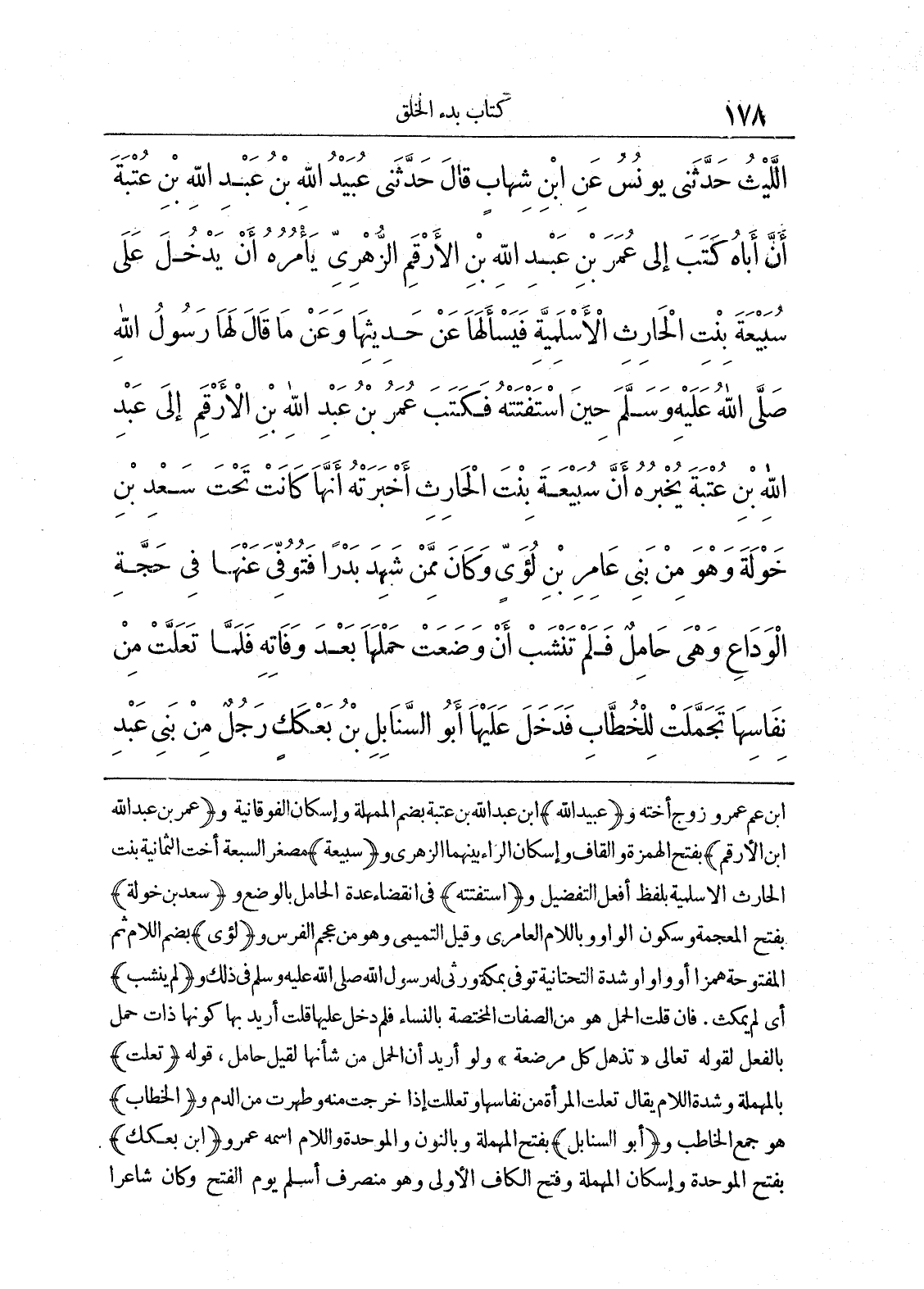 اللَّيْثُ حَدَّثَنِي يُونُسُ عَنْ ابْنِ شِهَابٍ قَالَ حَدَّثَنِي عُبَيْدُ اللَّهِ بْنُ عَبْدِ اللَّهِ بْنِ عُتْبَةَ أَنَّ أَبَاهُ كَتَبَ إِلَى عُمَرَ بْنِ عَبْدِ اللَّهِ بْنِ الْأَرْقَمِ الزُّهْرِيِّ يَامُرُهُ أَنْ يَدْخُلَ عَلَى سُبَيْعَةَ بِنْتِ الْحَارِثِ الْأَسْلَمِيَّةِ فَيَسْأَلَهَا عَنْ حَدِيثِهَا وَعَنْ مَا قَالَ لَهَا رَسُولُ اللَّهِ صَلَّى اللَّهُ عَلَيْهِ وَسَلَّمَ حِينَ اسْتَفْتَتْهُ فَكَتَبَ عُمَرُ بْنُ عَبْدِ اللَّهِ بْنِ الْأَرْقَمِ إِلَى عَبْدِ اللَّهِ بْنِ عُتْبَةَ يُخْبِرُهُ أَنَّ سُبَيْعَةَ بِنْتَ الْحَارِثِ أَخْبَرَتْهُ أَنَّهَا كَانَتْ تَحْتَ سَعْدِ بْنِ خَوْلَةَ وَهُوَ مِنْ بَنِي عَامِرِ بْنِ لُؤَيٍّ وَكَانَ مِمَّنْ شَهِدَ بَدْرًا فَتُوُفِّيَ عَنْهَا فِي حَجَّةِ الْوَدَاعِ وَهِيَ حَامِلٌ فَلَمْ تَنْشَبْ أَنْ وَضَعَتْ حَمْلَهَا بَعْدَ وَفَاتِهِ فَلَمَّا تَعَلَّتْ مِنْ نِفَاسِهَا تَجَمَّلَتْ لِلْخُطَّابِ فَدَخَلَ عَلَيْهَا أَبُو السَّنَابِلِ بْنُ بَعْكَكٍ رَجُلٌ مِنْ بَنِي عَبْدِ