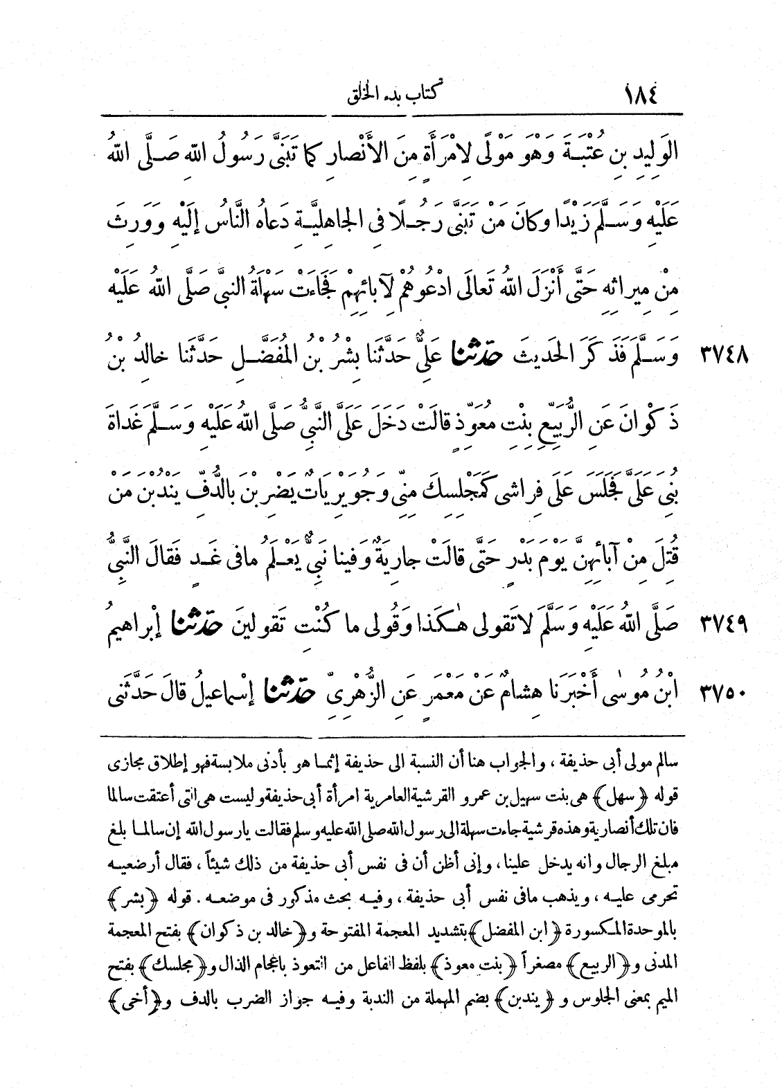 الْوَلِيدِ بْنِ عُتْبَةَ وَهُوَ مَوْلًى لِامْرَأَةٍ مِنْ الْأَنْصَارِ كَمَا تَبَنَّى رَسُولُ اللَّهِ صَلَّى اللَّهُ عَلَيْهِ وَسَلَّمَ زَيْدًا وَكَانَ مَنْ تَبَنَّى رَجُلًا فِي الْجَاهِلِيَّةِ دَعَاهُ النَّاسُ إِلَيْهِ وَوَرِثَ مِنْ مِيرَاثِهِ حَتَّى أَنْزَلَ اللَّهُ تَعَالَى {ادْعُوهُمْ لِآبَائِهِمْ} فَجَاءَتْ سَهْلَةُ النَّبِيَّ صَلَّى اللَّهُ عَلَيْهِ وَسَلَّمَ فَذَكَرَ الْحَدِيثَ
