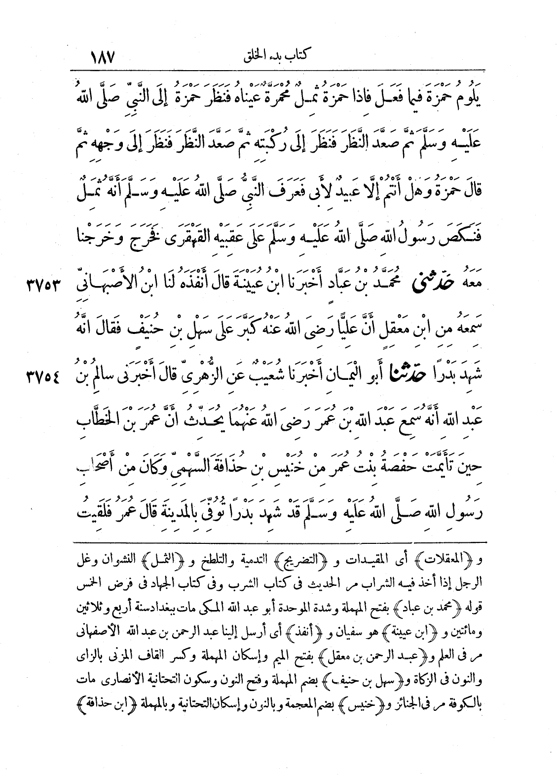 و (المعقلات) أي المقيدات و (التضريح) التدمية والتلطخ و (الثمل) النشوان وغل الرجل إذا أخذ فيه الشراب مر الحديث في كتاب الشرب وفي كتاب الجهاد في فرض الخمس قوله (محمد بن عباد) بفتح المهملة وشدة الموحدة أبو عبد الله المكي مات ببغداد سنة أربع وثلاثين ومائتين و (ابن عيينة) هو سفيان و (ـنفذ) أي أرسل إلينا عبد الرحمن بن عبد الله الأصفهاني مر في العلم و (عبد الرحمن بن معقل) بفتح الميم وإسكان المهملة وكسر القاف المزني بالزاي والنون في الزكاة و (سهل بن حنيف) بضم المهملة وفتح النون وسكون التحتانية الأنصاري مات بالكوفة مر في الجنائز و (خنيس) بضم المعجمة وبالنون وإسكان التحتانية وبالمهملة (ابن حذافة)