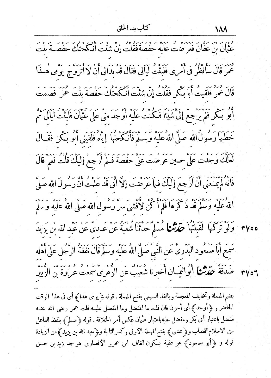 عُثْمَانَ بْنَ عَفَّانَ فَعَرَضْتُ عَلَيْهِ حَفْصَةَ فَقُلْتُ إِنْ شِئْتَ أَنْكَحْتُكَ حَفْصَةَ بِنْتَ عُمَرَ قَالَ سَأَنْظُرُ فِي أَمْرِي فَلَبِثْتُ لَيَالِيَ فَقَالَ قَدْ بَدَا لِي أَنْ لَا أَتَزَوَّجَ يَوْمِي هَذَا قَالَ عُمَرُ فَلَقِيتُ