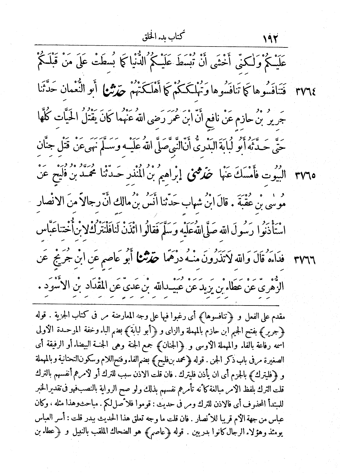 3764 - حَدَّثَنَا أَبُو النُّعْمَانِ حَدَّثَنَا جَرِيرُ بْنُ حَازِمٍ عَنْ نَافِعٍ أَنَّ ابْنَ عُمَرَ رَضِيَ اللَّهُ عَنْهُمَا كَانَ يَقْتُلُ الْحَيَّاتِ كُلَّهَا حَتَّى حَدَّثَهُ أَبُو لُبَابَةَ الْبَدْرِيُّ أَنَّ النَّبِيَّ صَلَّى اللَّهُ عَلَيْهِ وَسَلَّمَ نَهَى عَنْ قَتْلِ جِنَّانِ الْبُيُوتِ فَأَمْسَكَ عَنْهَا