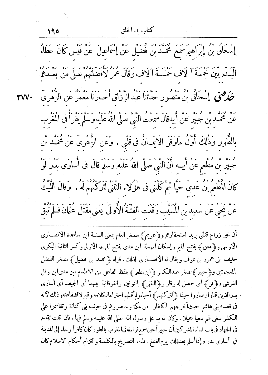 3770 - حَدَّثَنِي إِسْحَاقُ بْنُ مَنْصُورٍ حَدَّثَنَا عَبْدُ الرَّزَّاقِ أَخْبَرَنَا مَعْمَرٌ عَنْ الزُّهْرِيِّ عَنْ مُحَمَّدِ بْنِ جُبَيْرٍ عَنْ أَبِيهِ قَالَ سَمِعْتُ النَّبِيَّ صَلَّى اللَّهُ عَلَيْهِ وَسَلَّمَ يَقْرَأُ فِي الْمَغْرِبِ بِالطُّورِ وَذَلِكَ أَوَّلَ مَا وَقَرَ الْإِيمَانُ فِي قَلْبِي. وَعَنْ الزُّهْرِيِّ عَنْ مُحَمَّدِ بْنِ جُبَيْرِ بْنِ مُطْعِمٍ عَنْ أَبِيهِ أَنَّ النَّبِيَّ صَلَّى اللَّهُ عَلَيْهِ وَسَلَّمَ قَالَ فِي أُسَارَى بَدْرٍ لَوْ كَانَ الْمُطْعِمُ بْنُ عَدِيٍّ حَيًّا ثُمَّ كَلَّمَنِي فِي هَؤُلَاءِ النَّتْنَى لَتَرَكْتُهُمْ لَهُ وَقَالَ اللَّيْثُ عَنْ يَحْيَى بْنِ سَعِيدٍ عَنْ سَعِيدِ بْنِ الْمُسَيَّبِ وَقَعَتْ الْفِتْنَةُ الْأُولَى يَعْنِي مَقْتَلَ عُثْمَانَ فَلَمْ تُبْقِ