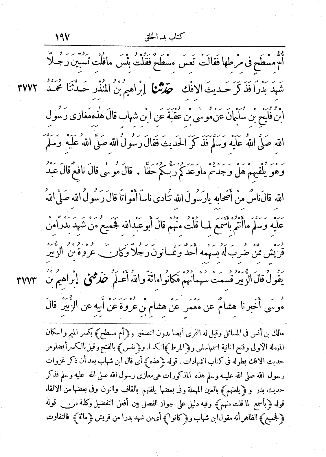 3772 - حَدَّثَنَا إِبْرَاهِيمُ بْنُ الْمُنْذِرِ حَدَّثَنَا مُحَمَّدُ بْنُ فُلَيْحِ بْنِ سُلَيْمَانَ عَنْ مُوسَى بْنِ عُقْبَةَ عَنْ ابْنِ شِهَابٍ قَالَ هَذِهِ مَغَازِي رَسُولِ اللَّهِ صَلَّى اللَّهُ عَلَيْهِ وَسَلَّمَ فَذَكَرَ الْحَدِيثَ فَقَالَ رَسُولُ اللَّهِ صَلَّى اللَّهُ عَلَيْهِ وَسَلَّمَ وَهُوَ يُلْقِيهِمْ هَلْ وَجَدْتُمْ مَا وَعَدَكُمْ رَبُّكُمْ حَقًّا قَالَ مُوسَى قَالَ نَافِعٌ قَالَ عَبْدُ اللَّهِ قَالَ نَاسٌ مِنْ أَصْحَابِهِ يَا رَسُولَ اللَّهِ تُنَادِي نَاسًا أَمْوَاتًا قَالَ رَسُولُ اللَّهِ صَلَّى اللَّهُ عَلَيْهِ وَسَلَّمَ مَا أَنْتُمْ بِأَسْمَعَ لِمَا قُلْتُ مِنْهُمْ قَالَ أَبُو عَبْد اللَّهِ فَجَمِيعُ مَنْ شَهِدَ بَدْرًا مِنْ قُرَيْشٍ مِمَّنْ ضُرِبَ لَهُ بِسَهْمِهِ أَحَدٌ وَثَمَانُونَ رَجُلًا وَكَانَ عُرْوَةُ بْنُ الزُّبَيْرِ يَقُولُ قَالَ الزُّبَيْرُ قُسِمَتْ سُهْمَانُهُمْ فَكَانُوا مِائَةً وَاللَّهُ أَعْلَمُ