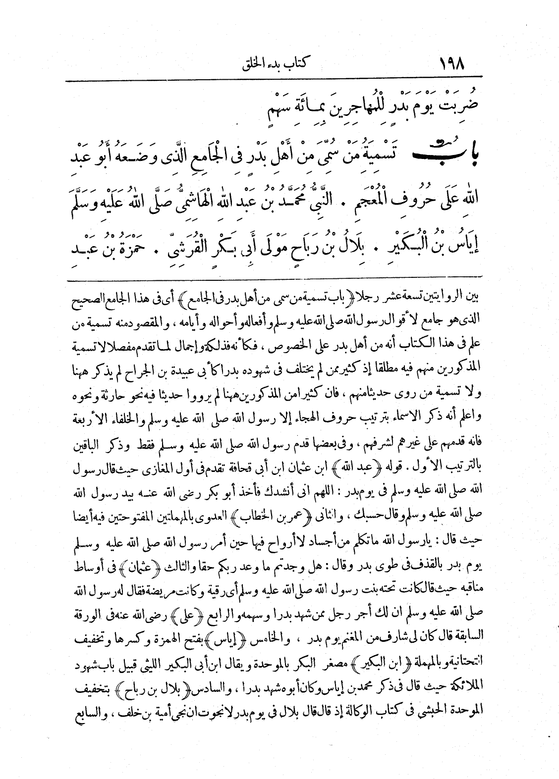بَاب تَسْمِيَةُ مَنْ سُمِّيَ مِنْ أَهْلِ بَدْرٍ فِي الْجَامِعِ الَّذِي وَضَعَهُ أَبُو عَبْدِ اللَّهِ عَلَى حُرُوفِ الْمُعْجَمِ