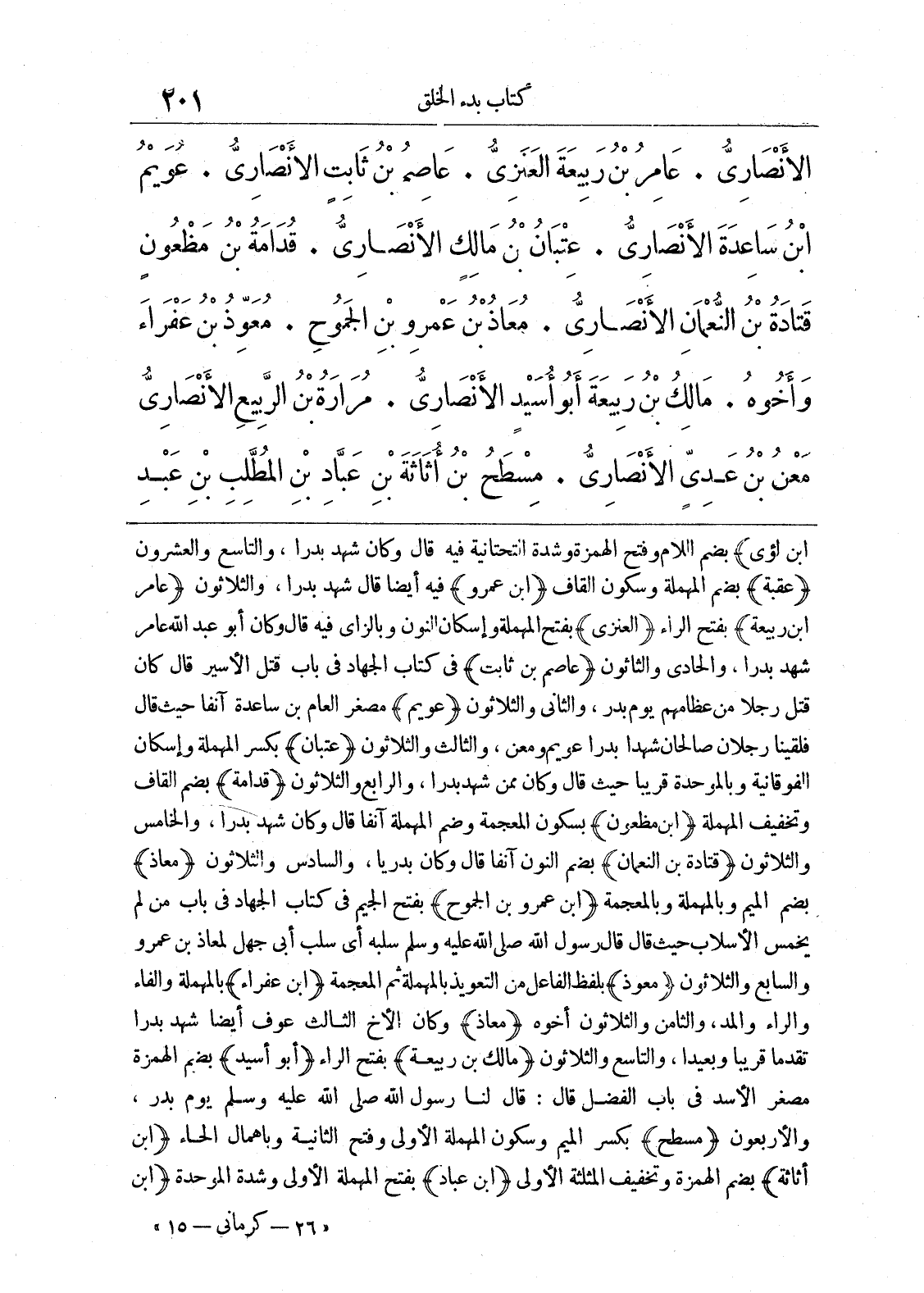ابن لؤي) بضم اللام وفتح الهمزة وشدة التحتانية فيه قال وكان شهد بدرا، والتاسع والعشرون (عقبة) بضم المهملة وسكون القاف (ابن عمرو) فيه أيضا قال شهد بدرا، والثلاثون (عامر ابن ربيعة) بفتح الراء (العنزي) بفتح المهملة وإسكان النون وبالزاي فيه قال وكان أبو عبد الله عامر شهد بدرا، والحادي والثلاثون (عاصم بن ثابت) في كتاب الجهاد في باب قتل الأسير قال كان قتل رجلا من عظامهم يوم بدر، والثاني والثلاثون (عويم) مصغر العام بن ساعدة آنفا حيث قال فلقينا رجلان صالحان شهدا بدرا عويم ومعن، والثالث والثلاثون (عتبان) بكسر المهملة وإسكان الفوقانية وبالموحدة قريبا حيث قال وكان ممن شهد بدرا، والرابع والثلاثون (قدامة) بضم القاف وتخفيف المهملة (ابن مظغون) بسكون المعجمة وضم المهملة آنفا قال وكان شهد بدرا، والخامس والثلاثون (قتادة بن النعمان) بضم النون آنفا قال وكان بدريا، والسادس والثلاثون (معاذ) بضم الميم وبالمهملة وبالمعجمة (ابن عمرو بن الجموح) بفتح الجيم في كتاب الجهاد في باب من لم يخمس الأسلاب حيث قال رسول الله صلى الله عليه وسلم سلبه أي سلب أبي جهل لمعاذ بن عمرو والسابع والثلاثون (معوذ) بلفظ الفاعل من التعويذ بالمهملة ثم المعجمة (ابن عفراء) بالمهملة والفاء والراء والمد، والثامن والثلاثون أخوه (معاذ) وكان الأخ الثالث عوف أيضا شهد بدرا تقدما قريبا وبعيدا، والتاسع والثلاثون (مالك بن ربيعة) بفتح الراء (أبو أسيد) بضم الهمزة مصغر الأسد في باب الفضل قال: قال لنا رسول الله صلى الله عليه وسلم يوم بدر، والأربعون (مسطح) بكسر الميم وسكون المهملة الأولى وفتح الثانية وبإهمال الحاء (ابن أثاثة) بضم الهمزة وتخفيف المثلثة الأولى (ابن عباد) بفتح المهملة الأولى وشدة الموحدة (ابن