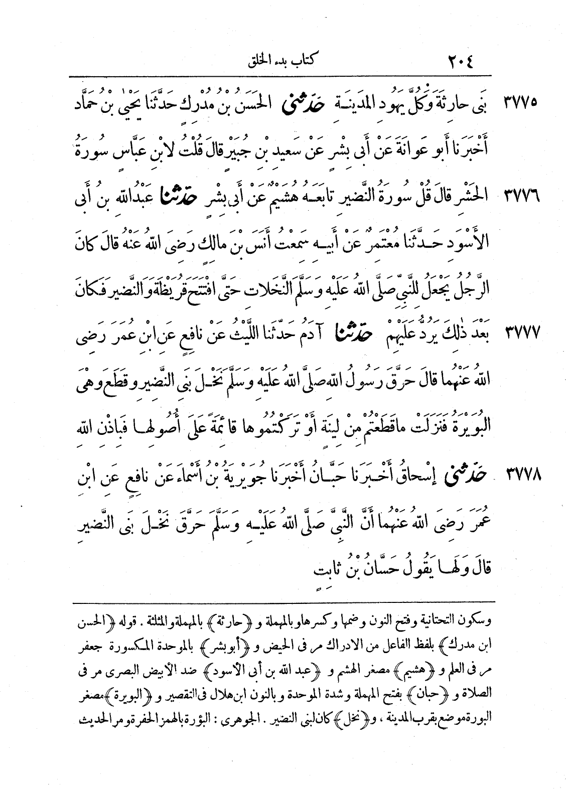 3775 - حَدَّثَنِي الْحَسَنُ بْنُ مُدْرِكٍ حَدَّثَنَا يَحْيَى بْنُ حَمَّادٍ أَخْبَرَنَا أَبُو عَوَانَةَ عَنْ أَبِي بِشْرٍ عَنْ سَعِيدِ بْنِ جُبَيْرٍ قَالَ قُلْتُ لِابْنِ عَبَّاسٍ سُورَةُ الْحَشْرِ قَالَ قُلْ سُورَةُ النَّضِيرِ تَابَعَهُ هُشَيْمٌ عَنْ أَبِي بِشْرٍ