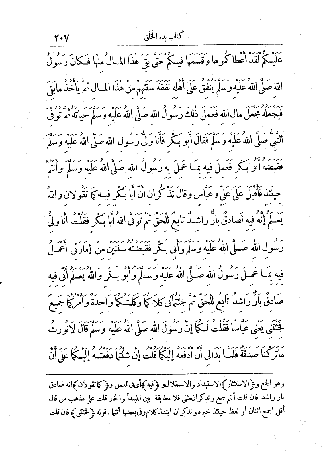 عَلَيْكُمْ لَقَدْ أَعْطَاكُمُوهَا وَقَسَمَهَا فِيكُمْ حَتَّى بَقِيَ هَذَا الْمَالُ مِنْهَا فَكَانَ رَسُولُ اللَّهِ صَلَّى اللَّهُ عَلَيْهِ وَسَلَّمَ يُنْفِقُ عَلَى أَهْلِهِ نَفَقَةَ سَنَتِهِمْ مِنْ هَذَا الْمَالِ ثُمَّ يَاخُذُ مَا بَقِيَ فَيَجْعَلُهُ مَجْعَلَ مَالِ اللَّهِ فَعَمِلَ ذَلِكَ رَسُولُ اللَّهِ صَلَّى اللَّهُ عَلَيْهِ وَسَلَّمَ حَيَاتَهُ ثُمَّ تُوُفِّيَ النَّبِيُّ صَلَّى اللَّهُ عَلَيْهِ وَسَلَّمَ فَقَالَ أَبُو بَكْرٍ فَأَنَا وَلِيُّ رَسُولِ اللَّهِ صَلَّى اللَّهُ عَلَيْهِ وَسَلَّمَ فَقَبَضَهُ أَبُو بَكْرٍ فَعَمِلَ فِيهِ بِمَا عَمِلَ بِهِ رَسُولُ اللَّهِ صَلَّى اللَّهُ عَلَيْهِ وَسَلَّمَ وَأَنْتُمْ حِينَئِذٍ فَأَقْبَلَ عَلَى عَلِيٍّ وَعَبَّاسٍ وَقَالَ تَذْكُرَانِ أَنَّ أَبَا بَكْرٍ فِيهِ كَمَا تَقُولَانِ وَاللَّهُ يَعْلَمُ إِنَّهُ فِيهِ لَصَادِقٌ بَارٌّ رَاشِدٌ تَابِعٌ لِلْحَقِّ ثُمَّ تَوَفَّى اللَّهُ أَبَا بَكْرٍ فَقُلْتُ أَنَا وَلِيُّ رَسُولِ اللَّهِ صَلَّى اللَّهُ عَلَيْهِ وَسَلَّمَ وَأَبِي بَكْرٍ فَقَبَضْتُهُ سَنَتَيْنِ مِنْ إِمَارَتِي أَعْمَلُ فِيهِ بِمَا عَمِلَ فِيهِ رَسُولُ اللَّهِ صَلَّى اللَّهُ عَلَيْهِ وَسَلَّمَ وَأَبُو بَكْرٍ وَاللَّهُ يَعْلَمُ أَنِّي فِيهِ صَادِقٌ بَارٌّ رَاشِدٌ تَابِعٌ لِلْحَقِّ ثُمَّ جِئْتُمَانِي كِلَاكُمَا وَكَلِمَتُكُمَا وَاحِدَةٌ وَأَمْرُكُمَا جَمِيعٌ فَجِئْتَنِي يَعْنِي عَبَّاسًا فَقُلْتُ لَكُمَا إِنَّ رَسُولَ اللَّهِ صَلَّى اللَّهُ عَلَيْهِ وَسَلَّمَ قَالَ لَا نُورَثُ مَا تَرَكْنَا صَدَقَةٌ فَلَمَّا بَدَا لِي أَنْ أَدْفَعَهُ إِلَيْكُمَا قُلْتُ إِنْ شِئْتُمَا دَفَعْتُهُ إِلَيْكُمَا عَلَى أَنَّ