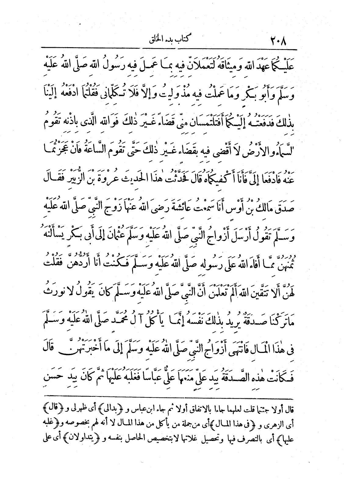 عَلَيْكُمَا عَهْدَ اللَّهِ وَمِيثَاقَهُ لَتَعْمَلَانِ فِيهِ بِمَا عَمِلَ فِيهِ رَسُولُ اللَّهِ صَلَّى اللَّهُ عَلَيْهِ وَسَلَّمَ وَأَبُو بَكْرٍ وَمَا عَمِلْتُ فِيهِ مُنْذُ وَلِيتُ وَإِلَّا فَلَا تُكَلِّمَانِي فَقُلْتُمَا ادْفَعْهُ إِلَيْنَا بِذَلِكَ فَدَفَعْتُهُ إِلَيْكُمَا أَفَتَلْتَمِسَانِ مِنِّي قَضَاءً غَيْرَ ذَلِكَ فَوَاللَّهِ الَّذِي بِإِذْنِهِ تَقُومُ السَّمَاءُ وَالْأَرْضُ لَا أَقْضِي فِيهِ بِقَضَاءٍ غَيْرِ ذَلِكَ حَتَّى تَقُومَ السَّاعَةُ فَإِنْ عَجَزْتُمَا عَنْهُ فَادْفَعَا إِلَيَّ فَأَنَا أَكْفِيكُمَاهُ قَالَ فَحَدَّثْتُ هَذَا الْحَدِيثَ عُرْوَةَ بْنَ الزُّبَيْرِ فَقَالَ صَدَقَ مَالِكُ بْنُ أَوْسٍ أَنَا سَمِعْتُ عَائِشَةَ رَضِيَ اللَّهُ عَنْهَا زَوْجَ النَّبِيِّ صَلَّى اللَّهُ عَلَيْهِ وَسَلَّمَ تَقُولُ أَرْسَلَ أَزْوَاجُ النَّبِيِّ صَلَّى اللَّهُ عَلَيْهِ وَسَلَّمَ عُثْمَانَ إِلَى أَبِي