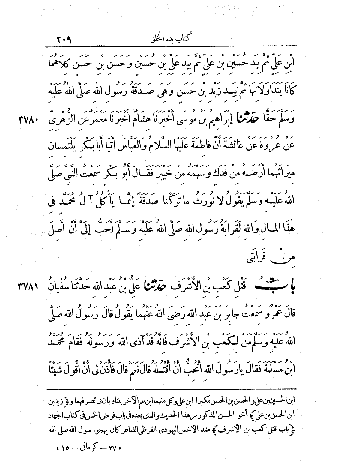 3781 - حَدَّثَنَا عَلِيُّ بْنُ عَبْدِ اللَّهِ حَدَّثَنَا سُفْيَانُ قَالَ عَمْرٌو سَمِعْتُ جَابِرَ بْنَ عَبْدِ اللَّهِ رَضِيَ اللَّهُ عَنْهُمَا يَقُولُ قَالَ رَسُولُ اللَّهِ صَلَّى اللَّهُ عَلَيْهِ وَسَلَّمَ مَنْ لِكَعْبِ بْنِ الْأَشْرَفِ فَإِنَّهُ قَدْ آذَى اللَّهَ وَرَسُولَهُ فَقَامَ مُحَمَّدُ بْنُ مَسْلَمَةَ فَقَالَ يَا رَسُولَ اللَّهِ أَتُحِبُّ أَنْ أَقْتُلَهُ قَالَ نَعَمْ قَالَ فَاذَنْ لِي أَنْ أَقُولَ شَيْئًا