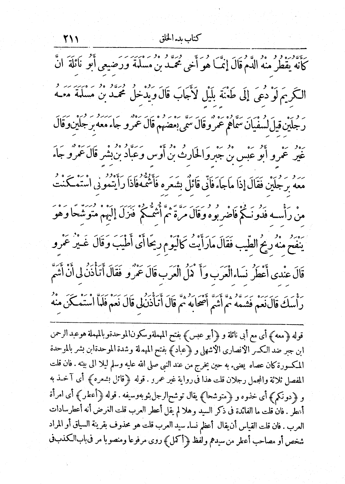 قوله (معه) أي مع أبي نائلة و (أبو عبس) بفتح المهملة وسكون الموحدة وبالمهملة هو عبد الرحمن ابن جبر ضد الكسر الأنصاري الأشهلي و (عباد) بفتح المهملة وشدة الموحدة ابن بشر بالموحدة المكسورة كان عصاه يضيء به حين يخرج من عند النبي صلى الله عليه وسلم ليلا إلى بيته. فإن قلت المفصل ثلاثة والمجمل رجلان قلت هذا في رواية غير عمرو. قوله (قائل بشعره) أي آخذ به و (دونكم) أي خذوه و (متوشحا) يقال توشح الرجل بثوبه وسيفه. قوله (أعطر) أي امرأة أعطر. فإن قلت ما الفائدة في ذكر السيد وهلا لم يقل أعطر العرب قلت الغرض أنه أعطر سادات العرب. فإن قلت القياس أن يقال أعظم نساء سيد العرب قلت هو محذوف بقرينه السياق أو المراد شخص أو مصاحب أعطر من سيدهم ولفظ (أكمل) روى مرفوعا ومنصوبا مر في باب الكذب في