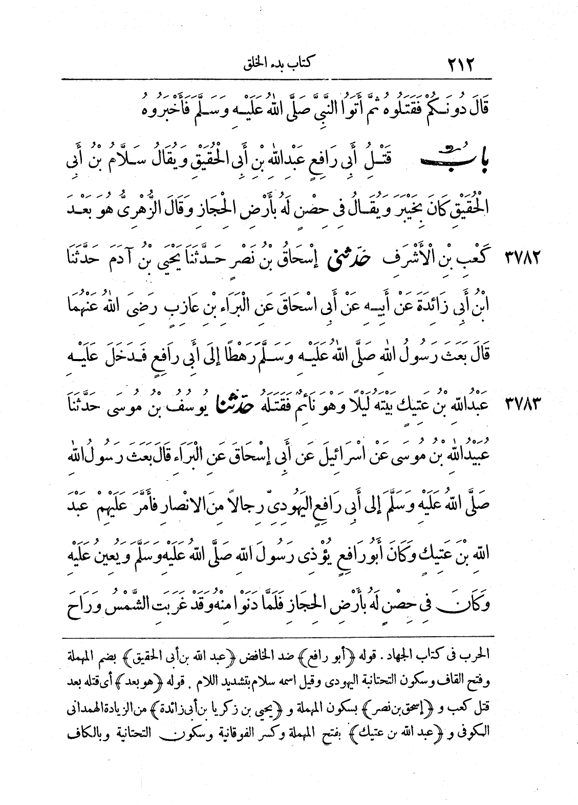 3782 - حَدَّثَنِي إِسْحَاقُ بْنُ نَصْرٍ حَدَّثَنَا يَحْيَى بْنُ آدَمَ حَدَّثَنَا ابْنُ أَبِي زَائِدَةَ عَنْ أَبِيهِ عَنْ أَبِي إِسْحَاقَ عَنْ الْبَرَاءِ بْنِ عَازِبٍ رَضِيَ اللَّهُ عَنْهُمَا قَالَ بَعَثَ رَسُولُ اللَّهِ صَلَّى اللَّهُ عَلَيْهِ وَسَلَّمَ رَهْطًا إِلَى أَبِي رَافِعٍ فَدَخَلَ عَلَيْهِ عَبْدُ اللَّهِ بْنُ عَتِيكٍ بَيْتَهُ لَيْلًا وَهُوَ نَائِمٌ فَقَتَلَهُ