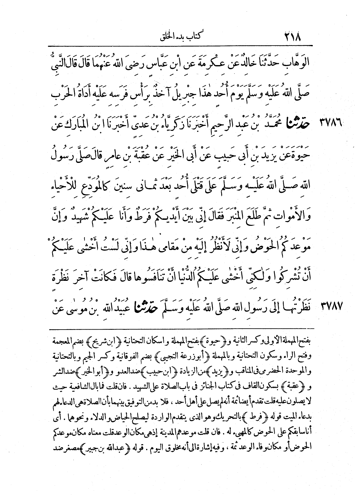 بفتح المهملة الأولى وكسر الثانية و (حيوة) بفتح المهملة وإسكان التحتانية (ابن شريح) بضم المعجمة وفتح الراء وسكون التحتانية وبالمهملة (أبو زرعة التجيبي) بضم الفوقانية وكسر الجيم وبالتحتانية والموحدة الحضرمي في المناقي و (يزيد) من الزيادة (ابن حبيب) ضد العدو و (أبو الخير) ضد الشر و (عقبة) بسكون القاف في كتاب الجنائز في باب الصلاة على الشهيد. فإن قلت فما بال الشافعية حيث لا يصلون عليه قلت تقدم أيضا ثمة أنه لم يصل على أهل أحد، فلا بد من التوفيق بينهما بأن الصلاة هي الدعاء لهم بدعاء الميت قوله (فرط) بالتحريك وهو الذي يتقدم الواردة ليصلح الحياض والدلاء ونحوهما. أي أنا سابقكم على الحوض كالمهيء له. فإن قلت موعدهم المدينة إذ هي مكان الوعد قلت معناه مكان موعدكم الحوض أو مكان وفاء الوعد ثمة، وفيه إشارة إلى أنه مخلوق اليوم. قوله (عبد الله بن جبير) مصغر ضد