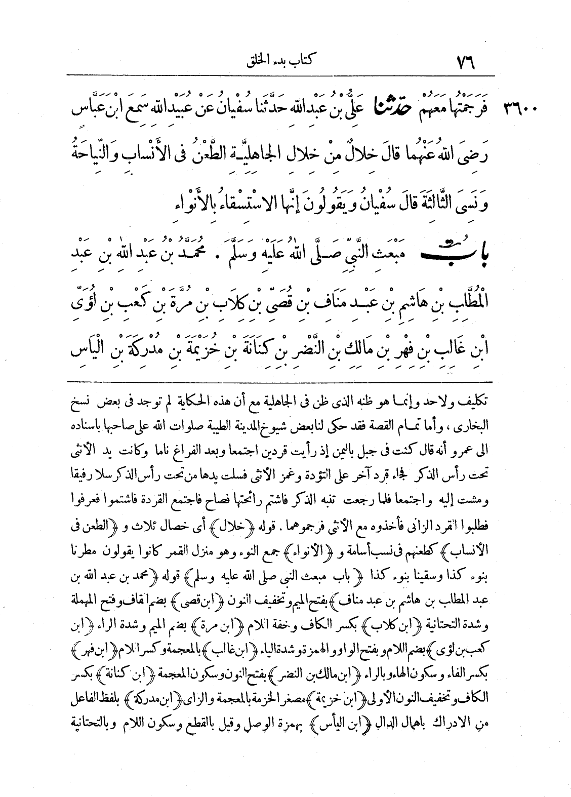 تكليف ولا حد وإنما هو ظنه الذي ظن في الجاهلية مع أن هذه الحكاية لم توجد في بعض نسخ البخاري، وأما تمام القصة فقد حكى لنا بعض شيوخ المدينة الطيبة صلوات الله على صاحبها بإسناده إلى عمرو أنه قال كنت في جبل باليمن إذ رأيت قردين اجتمعا وبعد الفراغ ناما وكانت يد الأنثى تحت رأس الذكر فجاء قرد آخر على التؤدة وغمز الأنثى فسلت يدها من تحت رأس الذكر سلا رفيقا ومشت إليه واجتمعا فلما رجعت تنبه الذكر فاشتم رائحتها فصاح فاجتمع القردة فاشتموا فعرفوا فطلبوا القرد الزاني فأخذوه مع الأنثى فرجموها. قوله) خلال) أي خصال ثلاث و (الطعن في الأنساب) كطعنهم في نسب أسامة و (الأنواء) جمع نوء وهو منزل القمر كانوا يقولون مطرنا بنوء كذا وسقينا بنوء كذا (باب مبعث النبي صلى الله عليه وسلم) قوله (محمد بن عبد الله بن عبد المطلب بن هاشم بن عبد مناف) بفتح الميم وتخفيف النون (ابن قصي) بضم القاف وفتح المهملة وشدة التحتانية (ابن كلاب) بكسر الكاف وخفة اللام (ابن مرة) بضم الميم وشدة الراء (ابن كعب بن لؤي) بضم اللام وبفتح الواو والهمزة وشدة الياء (ابن غالب) بالمعجمة وكسر اللام (ابن فهر) بكسر الفاء وسكون الهاء وبالراء (ابن مالك بن النضر) بفتح النون وسكون المعجمة (ابن كنانة) بكسر الكاف وتخفيف النون الأولى (ابن خزيمة) مصغر الخزمة بالمعجمة والزاي (ابن مدركة) بلفظ الفاعل من الإدراك بإهمال الدال (ابن اليأس) بهمزة الوصل وقيل بالقطع وسكون اللام وبالتحتانية