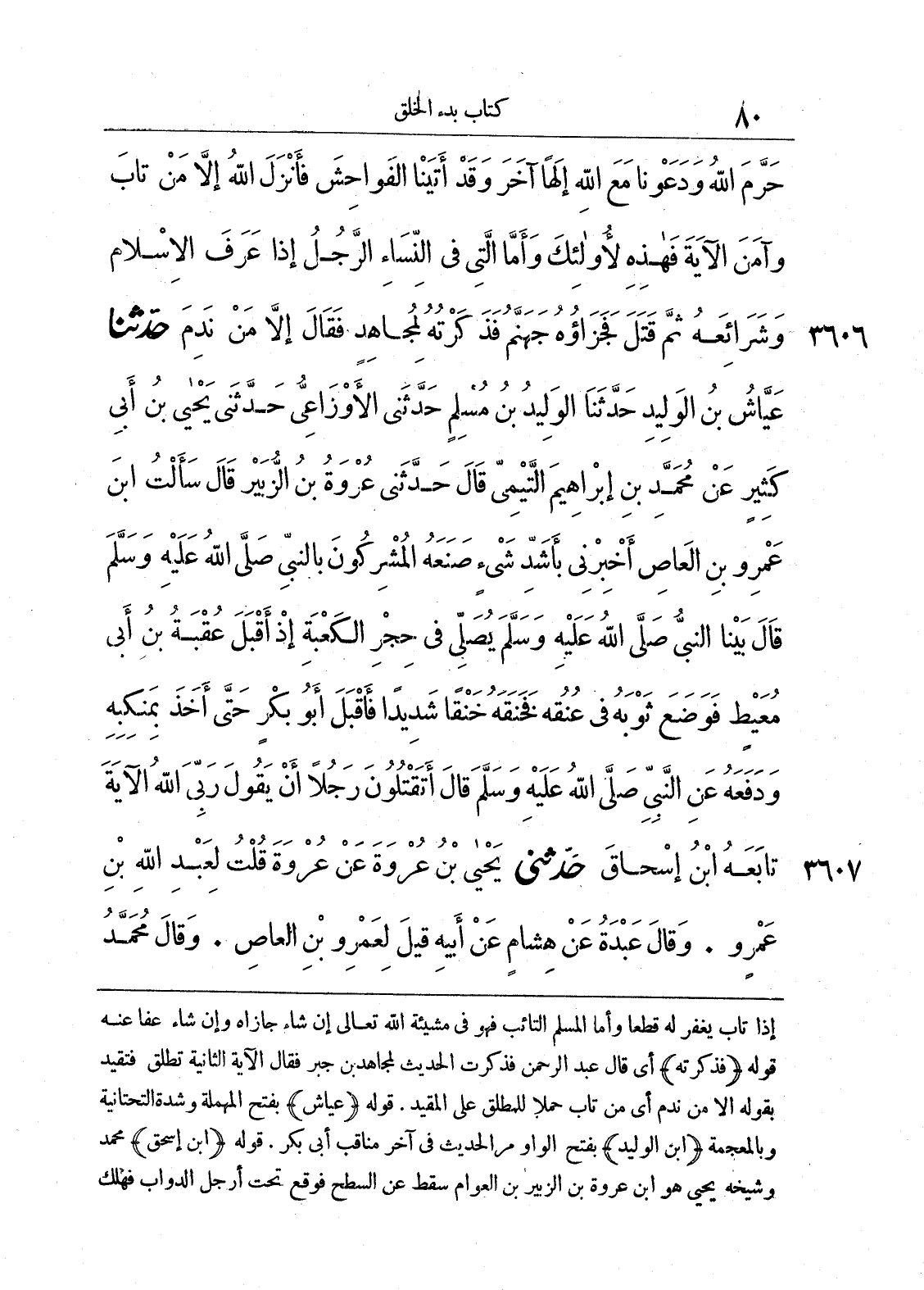 3606 - حدَّثَنَا عَيَّاشُ بْنُ الوَلِيدِ، حَدَّثَنَا الوَلِيدُ بْنُ مُسْلِمٍ، حَدَّثَنِي الأَوْزَاعِيُّ، حَدَّثَنِي يَحْيَى بْنُ أَبِي كَثِيرٍ، عَنْ مُحَمَّدِ بْنِ إِبْرَاهِيمَ التَّيْمِيِّ، قَالَ: حَدَّثَنِي عُرْوَةُ بْنُ الزُّبَيْرِ، قَالَ: سَأَلْتُ ابْنَ عَمْرِو بْنِ العَاصِ: أَخْبِرْنِي بِأَشَدِّ شَيْءٍ صَنَعَهُ المُشْرِكُونَ بِالنَّبِيِّ صَلَّى اللهُ عَلَيْهِ وَسَلَّمَ، قَالَ: «بَيْنَا النَّبِيُّ صَلَّى اللهُ عَلَيْهِ وَسَلَّمَ يُصَلِّي فِي حِجْرِ الكَعْبَةِ، إِذْ أَقْبَلَ عُقْبَةُ بْنُ أَبِي مُعَيْطٍ، فَوَضَعَ ثَوْبَهُ فِي عُنُقِهِ، فَخَنَقَهُ خَنْقًا شَدِيدًا» فَأَقْبَلَ أَبُو بَكْرٍ حَتَّى أَخَذَ بِمَنْكِبِهِ، وَدَفَعَهُ عَنِ النَّبِيِّ صَلَّى اللهُ عَلَيْهِ وَسَلَّمَ، قَالَ: {أَتَقْتُلُونَ رَجُلًا أَنْ يَقُولَ رَبِّيَ اللَّهُ}. الآيَةَ، تَابَعَهُ ابْنُ إِسْحَاقَ،