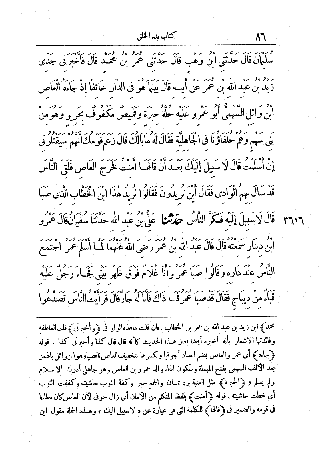 سُلَيْمَانَ قَالَ حَدَّثَنِي ابْنُ وَهْبٍ قَالَ حَدَّثَنِي عُمَرُ بْنُ مُحَمَّدٍ قَالَ فَأَخْبَرَنِي جَدِّي زَيْدُ بْنُ عَبْدِ اللَّهِ بْنِ عُمَرَ عَنْ أَبِيهِ قَالَ بَيْنَمَا هُوَ فِي الدَّارِ خَائِفًا إِذْ جَاءَهُ الْعَاصِ بْنُ وَائِلٍ السَّهْمِيُّ أَبُو عَمْرٍو عَلَيْهِ حُلَّةُ حِبَرَةٍ وَقَمِيصٌ مَكْفُوفٌ بِحَرِيرٍ وَهُوَ مِنْ بَنِي سَهْمٍ وَهُمْ حُلَفَاؤُنَا فِي الْجَاهِلِيَّةِ فَقَالَ لَهُ مَا بَالُكَ قَالَ زَعَمَ قَوْمُكَ أَنَّهُمْ سَيَقْتُلُونِي إِنْ أَسْلَمْتُ قَالَ لَا سَبِيلَ إِلَيْكَ بَعْدَ أَنْ قَالَهَا أَمِنْتُ فَخَرَجَ الْعَاصِ فَلَقِيَ النَّاسَ قَدْ سَالَ بِهِمْ الْوَادِي فَقَالَ أَيْنَ تُرِيدُونَ فَقَالُوا نُرِيدُ هَذَا ابْنَ الْخَطَّابِ الَّذِي صَبَا قَالَ لَا سَبِيلَ إِلَيْهِ فَكَرَّ النَّاسُ