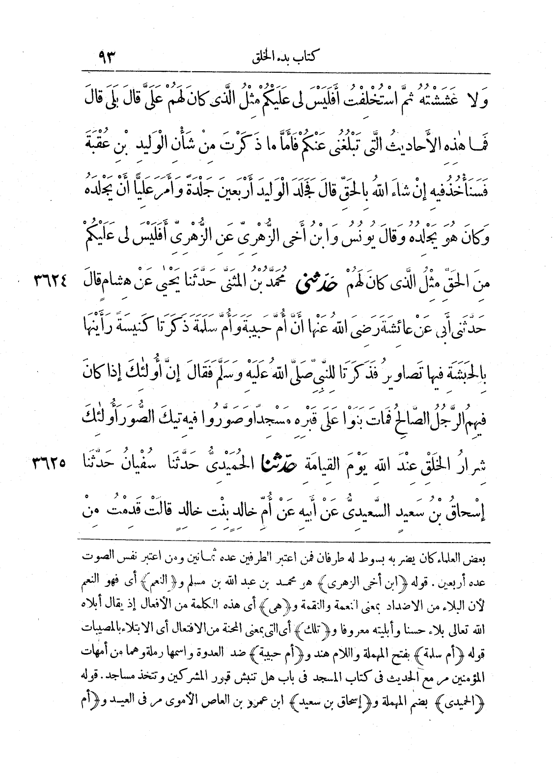 بعض العلماء كان يضر به بسوط له طرفان فمن اعتبر الطرفين عده ثمانين ومن نفس الصوت عده أربعين. قوله (ابن أخي الزهري) هو محمد بن عبد الله بن مسلم و (النعم) أي فهو النعم لأن البلاء من الاضداد بمعنى النعمة والنقمة و (هي) أي هذه الكلمة من الأفعال إذ يقال أبلاه الله تعالى بلاء حسنا وأبليته معروفا و (تلك) أي التي بمعنى المحنة من الافتعال أي الابتلاء بالمصيبات قوله (أم سلمة) بفتح المهملة واللام هند و (أم حبيبة) ضد العدوة واسمها رملة وهما من أمهات المؤمنين مر مع الحديث في كتاب المسجد في باب هل تنبش قبور المشركين وتتخذ مساجد. قوله (الحميدي) بضم المهملة و (إسحاق بن سعيد) ابن عمرو بن العاص الأموي مر في العيد و (أم