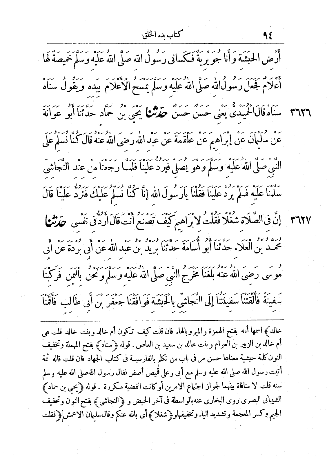 3626 - حَدَّثَنَا يَحْيَى بْنُ حَمَّادٍ حَدَّثَنَا أَبُو عَوَانَةَ عَنْ سُلَيْمَانَ عَنْ إِبْرَاهِيمَ عَنْ عَلْقَمَةَ عَنْ عَبْدِ اللَّهِ رَضِيَ اللَّهُ عَنْهُ قَالَ كُنَّا نُسَلِّمُ عَلَى النَّبِيِّ صَلَّى اللَّهُ عَلَيْهِ وَسَلَّمَ وَهُوَ يُصَلِّي فَيَرُدُّ عَلَيْنَا فَلَمَّا رَجَعْنَا مِنْ عِنْدِ النَّجَاشِيِّ سَلَّمْنَا عَلَيْهِ فَلَمْ يَرُدَّ عَلَيْنَا فَقُلْنَا يَا رَسُولَ اللَّهِ إِنَّا كُنَّا نُسَلِّمُ عَلَيْكَ فَتَرُدُّ عَلَيْنَا قَالَ إِنَّ فِي الصَّلَاةِ شُغْلًا فَقُلْتُ لِإِبْرَاهِيمَ كَيْفَ تَصْنَعُ أَنْتَ قَالَ أَرُدُّ فِي نَفْسِي
