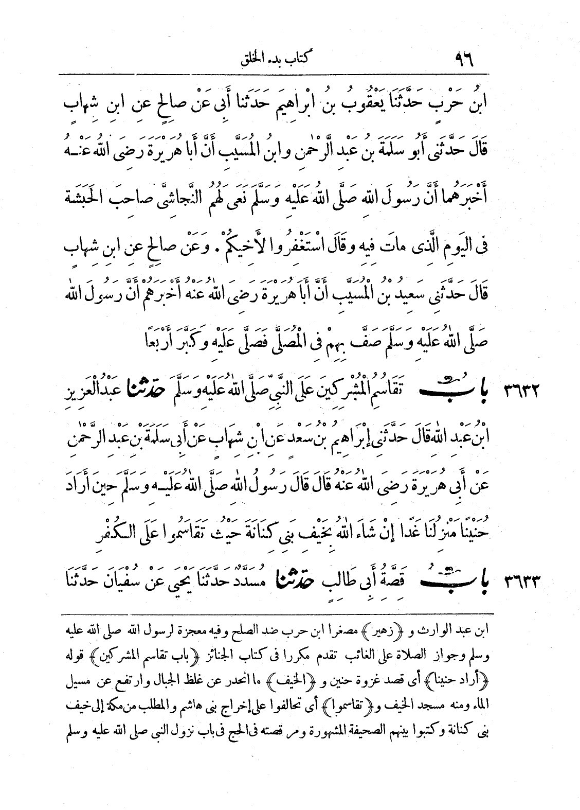 ابن عبد الوارث و (زهير) مصغرا ابن حرب ضد الصلح وفيه معجزة لرسول الله صلى الله عليه وسلم وجواز الصلاة على الغائب تقدم مكررا في كتاب الجنائز (باب تقاسم المشركين) قوله (أراد حنينا) أي قصد غزوة حنين و (الخيف) ما انحدر عن غلظ الجبال وارتفع عن مسيل الماء ومنه مسجد الخيف و (تقاسموا) أي تحالفوا على إخراج بني هاشم والمطلب من مكة إلى خيف بني كنانة وكتبوا بينهم الصحيفة المشهورة ومر قصته في الحج في باب نزول النبي صلى الله عليه وسلم