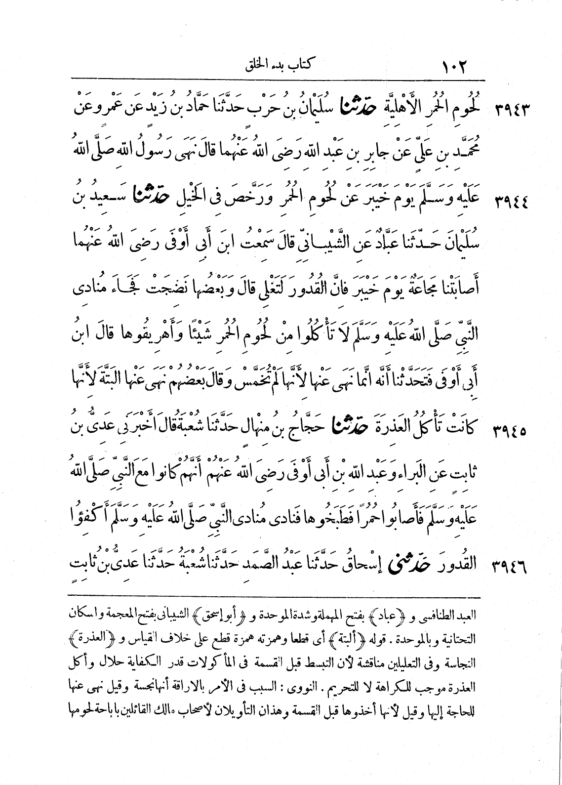 3944 - حَدَّثَنَا سَعِيدُ بْنُ سُلَيْمَانَ حَدَّثَنَا عَبَّادٌ عَنِ الشَّيْبَانِىِّ قَالَ سَمِعْتُ ابْنَ أَبِى أَوْفَى - رضى الله عنهما - أَصَابَتْنَا مَجَاعَةٌ يَوْمَ خَيْبَرَ، فَإِنَّ الْقُدُورَ لَتَغْلِى - قَالَ وَبَعْضُهَا نَضِجَتْ - فَجَاءَ مُنَادِى النَّبِىِّ صلى الله عليه وسلّم لاَ تَاكُلُوا مِنْ لُحُومِ الْحُمُرِ شَيْئاً وَأَهْرِيقُوهَا. قَالَ ابْنُ أَبِى أَوْفَى فَتَحَدَّثْنَا أَنَّهُ إِنَّمَا نَهَى عَنْهَا لأَنَّهَا لَمْ تُخَمَّسْ. وَقَالَ بَعْضُهُمْ نَهَى عَنْهَا الْبَتَّةَ، لأَنَّهَا كَانَتْ تَاكُلُ الْعَذِرَةَ.
