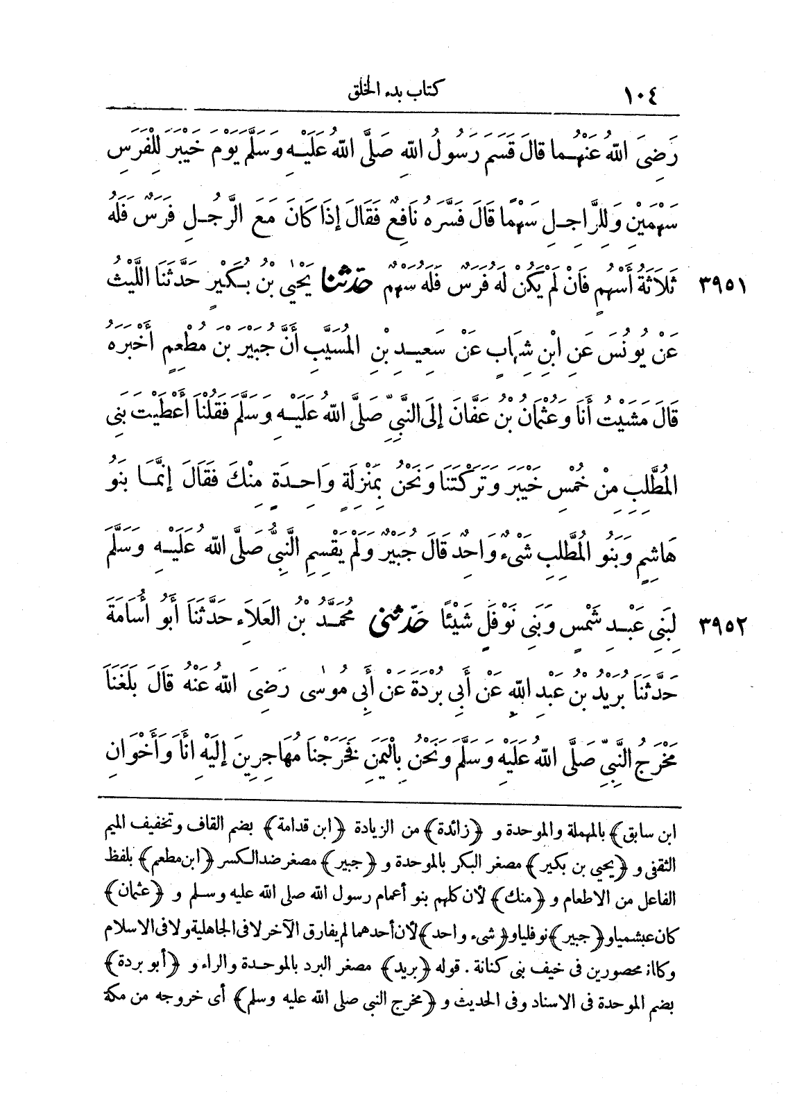 3951 - حَدَّثَنَا يَحْيَى بْنُ بُكَيْرٍ حَدَّثَنَا اللَّيْثُ عَنْ يُونُسَ عَنِ ابْنِ شِهَابٍ عَنْ سَعِيدِ بْنِ الْمُسَيَّبِ أَنَّ جُبَيْرَ بْنَ مُطْعِمٍ أَخْبَرَهُ قَالَ مَشَيْتُ أَنَا وَعُثْمَانُ بْنُ عَفَّانَ إِلَى النَّبِىِّ صلى الله عليه وسلّم فَقُلْنَا أَعْطَيْتَ بَنِى الْمُطَّلِبِ مِنْ خُمْسِ خَيْبَرَ، وَتَرَكْتَنَا، وَنَحْنُ بِمَنْزِلَةٍ وَاحِدَةٍ مِنْكَ. فَقَالَ «إِنَّمَا بَنُو هَاشِمٍ وَبَنُو الْمُطَّلِبِ شَىْءٌ وَاحِدٌ». قَالَ جُبَيْرٌ وَلَمْ يَقْسِمِ النَّبِىُّ صلى الله عليه وسلّم لِبَنِى عَبْدِ شَمْسٍ وَبَنِى نَوْفَلٍ شَيْئاً.