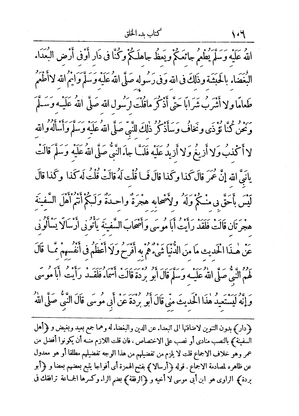 الله عليه وسلم يُطْعِمُ جَائِعَكُمْ، وَيَعِظُ جَاهِلَكُمْ، وَكُنَّا فِى دَارِ أَوْ فِى أَرْضِ الْبُعَدَاءِ الْبُغَضَاءِ بِالْحَبَشَةِ، وَذَلِكَ فِى اللَّهِ وَفِى رَسُولِهِ صلى الله عليه وسلّم وَايْمُ اللَّهِ، لاَ أَطْعَمُ طَعَاماً، وَلاَ أَشْرَبُ شَرَاباً حَتَّى أَذْكُرَ مَا قُلْتَ لِرَسُولِ اللَّهِ صلى الله عليه وسلّم وَنَحْنُ كُنَّا نُؤْذَى وَنُخَافُ، وَسَأَذْكُرُ ذَلِكَ لِلنَّبِىِّ صلى الله عليه وسلّم وَأَسْأَلُهُ، وَاللَّهِ لاَ أَكْذِبُ وَلاَ أَزِيغُ وَلاَ أَزِيدُ عَلَيْهِ. فَلَمَّا جَاءَ النَّبِىُّ صلى الله عليه وسلّم قَالَتْ يَا نَبِىَّ اللَّهِ إِنَّ عُمَرَ قَالَ كَذَا وَكَذَا. قَالَ «فَمَا قُلْتِ لَهُ». قَالَتْ قُلْتُ لَهُ كَذَا وَكَذَا. قَالَ «لَيْسَ بِأَحَقَّ بِى مِنْكُمْ، وَلَهُ وَلأَصْحَابِهِ هِجْرَةٌ وَاحِدَةٌ، وَلَكُمْ أَنْتُمْ أَهْلَ السَّفِينَةِ هِجْرَتَانِ». قَالَتْ فَلَقَدْ رَأَيْتُ أَبَا مُوسَى وَأَصْحَابَ السَّفِينَةِ يَاتُونِى أَرْسَالاً، يَسْأَلُونِى عَنْ هَذَا الْحَدِيثِ، مَا مِنَ الدُّنْيَا شَىْءٌ هُمْ بِهِ أَفْرَحُ وَلاَ أَعْظَمُ فِى أَنْفُسِهِمْ مِمَّا قَالَ لَهُمُ النَّبِىُّ صلى الله عليه وسلّم. قَالَ أَبُو بُرْدَةَ قَالَتْ أَسْمَاءُ فَلَقَدْ رَأَيْتُ أَبَا مُوسَى وَإِنَّهُ لَيَسْتَعِيدُ هَذَا الْحَدِيثَ مِنِّى. قَالَ أَبُو بُرْدَةَ عَنْ أَبِى مُوسَى قَالَ النَّبِىُّ صلى الله