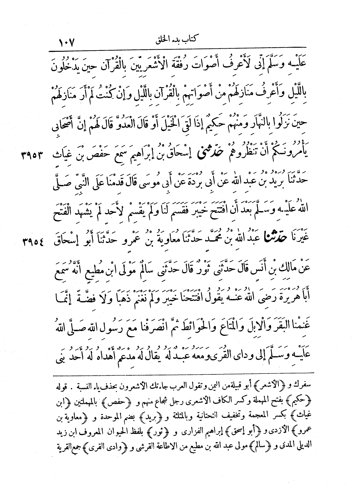 3953 - حَدَّثَنِى إِسْحَاقُ بْنُ إِبْرَاهِيمَ سَمِعَ حَفْصَ بْنَ غِيَاثٍ حَدَّثَنَا بُرَيْدُ بْنُ عَبْدِ اللَّهِ عَنْ أَبِى بُرْدَةَ عَنْ أَبِى مُوسَى قَالَ قَدِمْنَا عَلَى النَّبِىِّ صلى الله عليه وسلّم بَعْدَ أَنِ افْتَتَحَ خَيْبَرَ، فَقَسَمَ لَنَا، وَلَمْ يَقْسِمْ لأَحَدٍ لَمْ يَشْهَدِ الْفَتْحَ غَيْرَنَا.