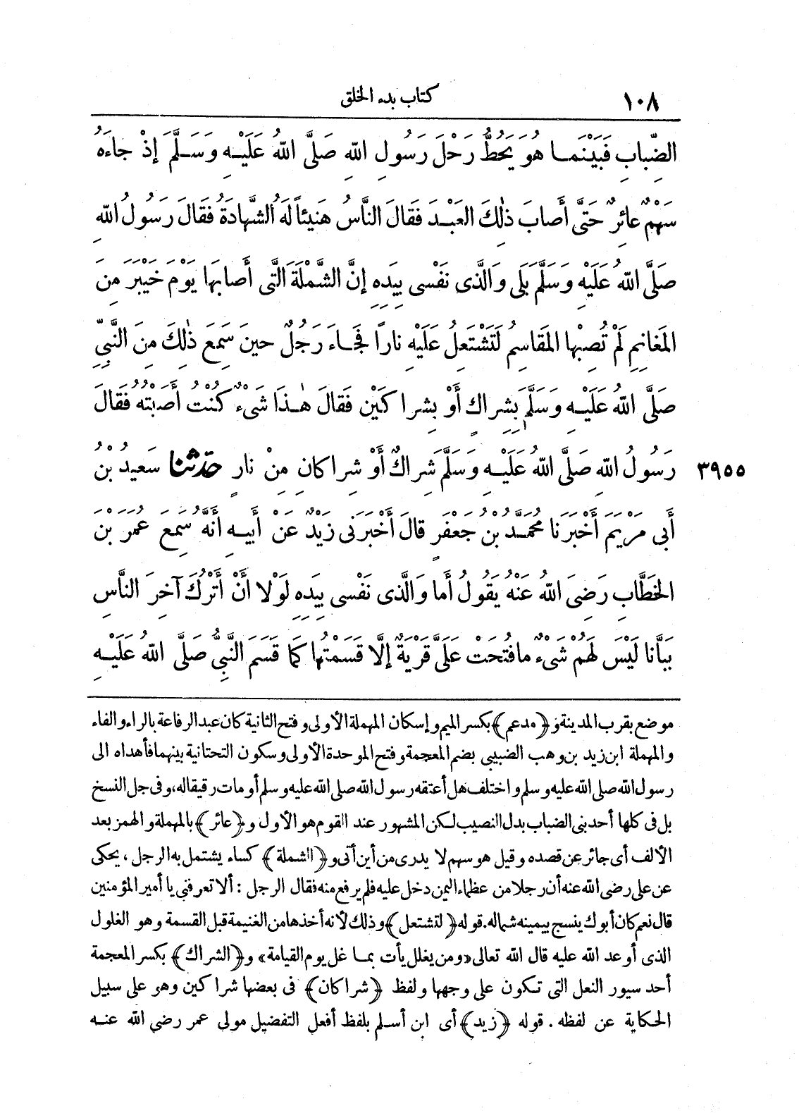 موضع بقرب المدينة و) مدعم (بكسر الميم وإسكان المهملة الأولى وفتح الثانية كان عبد الرفاعة بالراء والفاء والمهملة ابن يزيد بن وهب الضبيبي بضم المعجمة وفتح الموحدة الأولى وسكون التحتانية بينهما فأهداه إلى رسول الله صلى الله عليه وسلم واختلف هل اعتقه رسول الله صلى الله عليه وسلم أو مات رقيقا له وفي جل النسخ بل في كلها احدبني الضباب بدل النصيب لكن المشهور عند القوم هو الأول و) عائر (بالمهملة والهمز بعد الألف أي جائر عن قصده وقيل هو سهم لا يدري من أين أتى و) الشملة (كساء يشتمل به الرجل، يحكى عن علي رضي الله عنه أن رجلا من عظماء اليمن دخل عليه فلم يرفع منه فقال الرجل: إلا تعرفني يا أمير المؤمنين قال نعم كان ابرك ينسج بيمينه شماله. قوله) لتشتعل (وذلك لأنه أخذها من الغنيمة قبل القسمة وهو الفلول الذي أوعد الله عليه قال الله تعالى)) ومن يغلل يأت بما غل يوم القيامة ((و) الشراك (بكسر المعجمة احد سيور النعل التي تكون على وجهها ولفظ) شرا كان (في بعضها شرا كين وهو على سبيل الحكاية عن لفظه. قوله) زيد (أي ابن اسلم بلفظ افعل التفضيل مولى عمر رضي الله عنه