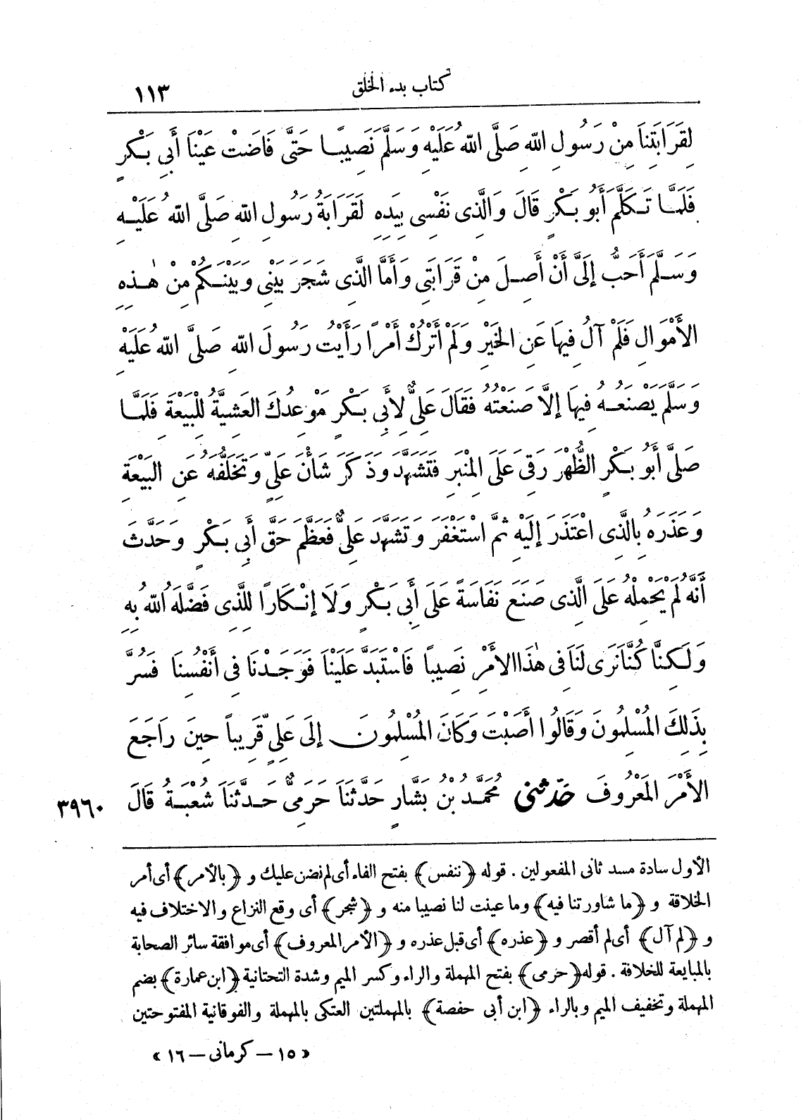 لِقَرَابَتِنَا مِنْ رَسُولِ اللَّهِ صلى الله عليه وسلّم نَصِيباً. حَتَّى فَاضَتْ عَيْنَا أَبِى بَكْرٍ، فَلَمَّا تَكَلَّمَ أَبُو بَكْرٍ قَالَ وَالَّذِى نَفْسِى بِيَدِهِ لَقَرَابَةُ رَسُولِ اللَّهِ صلى الله عليه وسلّم أَحَبُّ إِلَىَّ أَنْ أَصِلَ مِنْ قَرَابَتِى، وَأَمَّا الَّذِى شَجَرَ بَيْنِى وَبَيْنَكُمْ مِنْ هَذِهِ الأَمْوَالِ، فَلَمْ آلُ فِيهَا عَنِ الْخَيْرِ، وَلَمْ أَتْرُكْ أَمْراً رَأَيْتُ رَسُولَ اللَّهِ صلى الله عليه وسلّم يَصْنَعُهُ فِيهَا إِلاَّ صَنَعْتُهُ. فَقَالَ عَلِىٌّ لأَبِى بَكْرٍ مَوْعِدُكَ الْعَشِيَّةُ لِلْبَيْعَةِ. فَلَمَّا صَلَّى أَبُو بَكْرٍ الظُّهْرَ رَقِىَ عَلَى الْمِنْبَرِ، فَتَشَهَّدَ وَذَكَرَ شَانَ عَلِىٍّ، وَتَخَلُّفَهُ عَنِ الْبَيْعَةِ، وَعُذْرَهُ بِالَّذِى اعْتَذَرَ إِلَيْهِ، ثُمَّ اسْتَغْفَرَ، وَتَشَهَّدَ عَلِىٌّ فَعَظَّمَ حَقَّ أَبِى بَكْرٍ، وَحَدَّثَ أَنَّهُ لَمْ يَحْمِلْهُ عَلَى الَّذِى صَنَعَ نَفَاسَةً عَلَى أَبِى بَكْرٍ، وَلاَ إِنْكَاراً لِلَّذِى فَضَّلَهُ اللَّهُ بِهِ، وَلَكِنَّا نَرَى لَنَا فِى هَذَا الأَمْرِ نَصِيباً، فَاسْتَبَدَّ عَلَيْنَا، فَوَجَدْنَا فِى أَنْفُسِنَا، فَسُرَّ بِذَلِكَ الْمُسْلِمُونَ وَقَالُوا أَصَبْتَ. وَكَانَ الْمُسْلِمُونَ إِلَى عَلِىٍّ قَرِيباً، حِينَ رَاجَعَ الأَمْرَ الْمَعْرُوفَ.