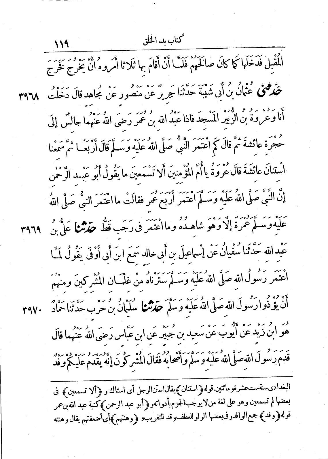 3968 - حَدَّثَنِى عُثْمَانُ بْنُ أَبِى شَيْبَةَ حَدَّثَنَا جَرِيرٌ عَنْ مَنْصُورٍ عَنْ مُجَاهِدٍ قَالَ دَخَلْتُ أَنَا وَعُرْوَةُ بْنُ الزُّبَيْرِ الْمَسْجِدَ فَإِذَا عَبْدُ اللَّهِ بْنُ عُمَرَ - رضى الله عنهما - جَالِسٌ إِلَى حُجْرَةِ عَائِشَةَ ثُمَّ قَالَ كَمِ اعْتَمَرَ النَّبِىُّ صلى الله عليه وسلّم قَالَ أَرْبَعاً {إِحْدَاهُنَّ فِى رَجَبٍ}. ثُمَّ سَمِعْنَا اسْتِنَانَ عَائِشَةَ قَالَ عُرْوَةُ يَا أُمَّ الْمُؤْمِنِينَ أَلاَ تَسْمَعِينَ مَا يَقُولُ أَبُو عَبْدِ الرَّحْمَنِ إِنَّ النَّبِىَّ صلى الله عليه وسلّم اعْتَمَرَ أَرْبَعَ عُمَرٍ. فَقَالَتْ مَا اعْتَمَرَ النَّبِىُّ صلى الله عليه وسلّم عُمْرَةً إِلاَّ وَهْوَ شَاهِدُهُ، وَمَا اعْتَمَرَ فِى رَجَبٍ قَطُّ.