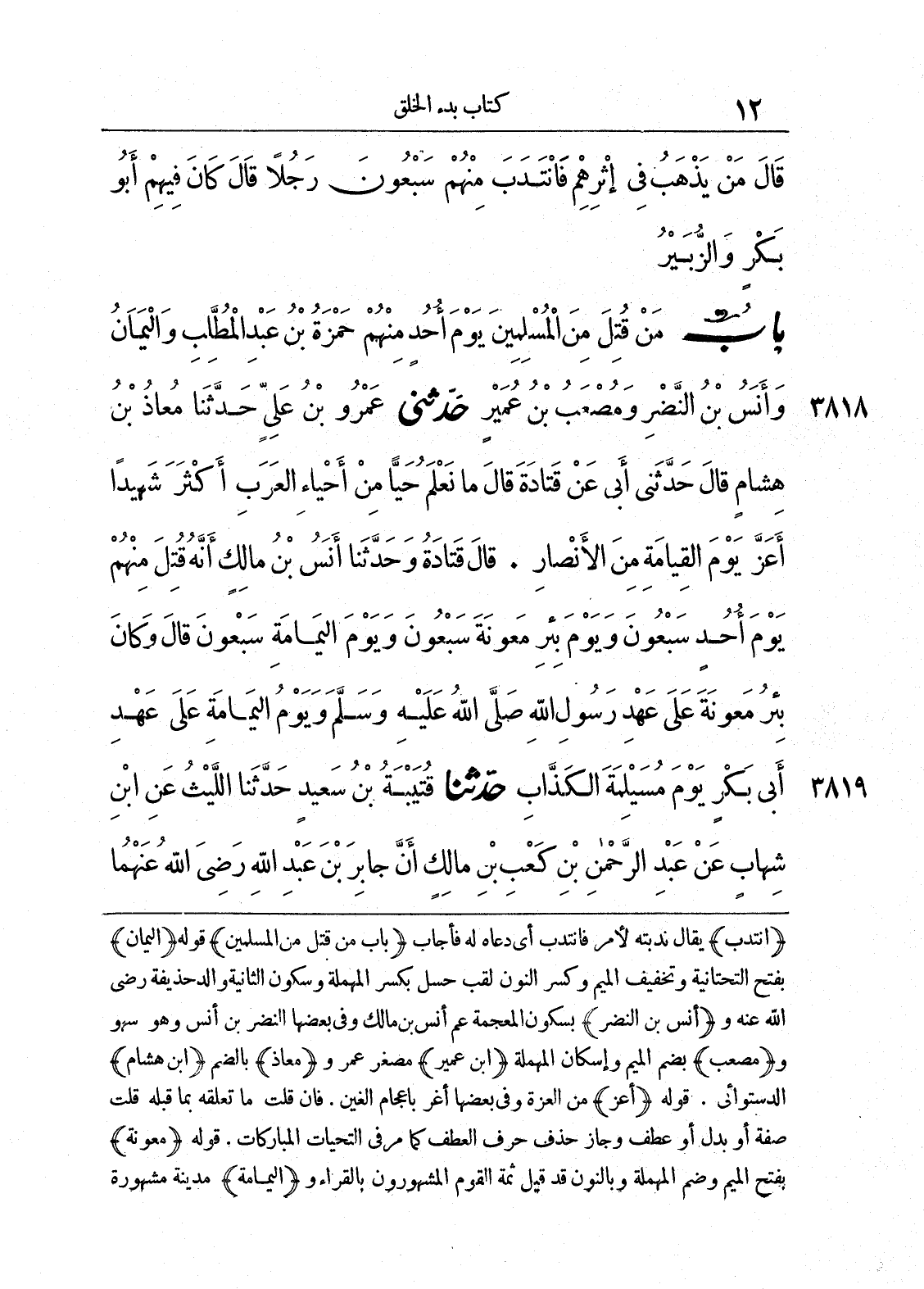 3818 - حَدَّثَنِى عَمْرُو بْنُ عَلِىٍّ حَدَّثَنَا مُعَاذُ بْنُ هِشَامٍ قَالَ حَدَّثَنِى أَبِى عَنْ قَتَادَةَ قَالَ مَا نَعْلَمُ حَيًّا مِنْ أَحْيَاءِ الْعَرَبِ أَكْثَرَ شَهِيداً أَعَزَّ يَوْمَ الْقِيَامَةِ مِنَ الأَنْصَارِ. قَالَ قَتَادَةُ وَحَدَّثَنَا أَنَسُ بْنُ مَالِكٍ أَنَّهُ قُتِلَ مِنْهُمْ يَوْمَ أُحُدٍ سَبْعُونَ، وَيَوْمَ بِئْرِ مَعُونَةَ سَبْعُونَ، وَيَوْمَ الْيَمَامَةِ سَبْعُونَ، قَالَ وَكَانَ بِئْرُ مَعُونَةَ عَلَى عَهْدِ رَسُولِ اللَّهِ صلى الله عليه وسلّم، وَيَوْمُ الْيَمَامَةِ عَلَى عَهْدِ أَبِى بَكْرٍ يَوْمَ مُسَيْلِمَةَ الْكَذَّابِ.
