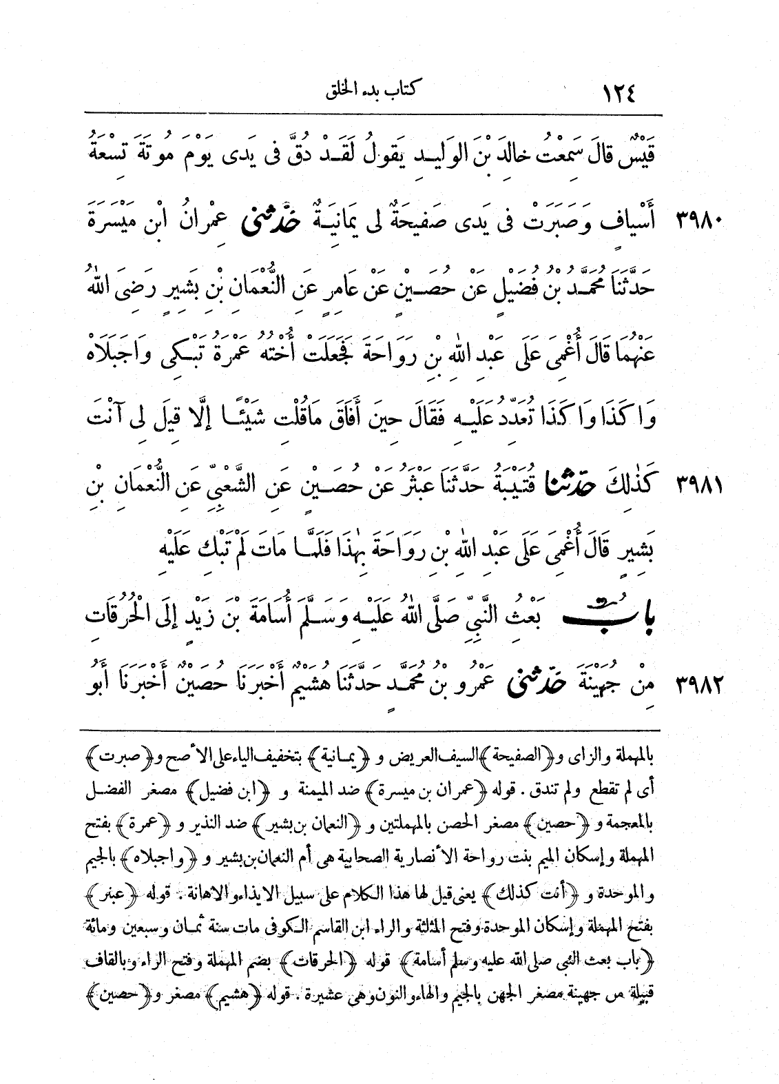 بالمهملة والزاي و) الصفيحة (السيف العريض و) يمانية (بتخفيف الياء على الأصح و) صبرت (أي لم تقطع ولم تندق. قوله) عمران بن مسيرة (ضد الميمنة و) ابن فضيل (مصغر الفضل بالمعجمة) حصين (مصغر الحصن بالمهملتين والنعمان بن بشير ضد النذير و) عمرة (بفتح المهملة وإسكان الميم بنت رواحة الانصارية الصحابية هي أم النعمان بن بشير و) أجبلاه (بالجيم والموحدة و) أنت كذلك (يعني قيل لها هذا الكلام على سبيل الإيذاء والاهانة. قوله) عبنر (بفتح المهملة وإسكان الموحدة وفتح المثلثة والراء ابن القاسم الكوفي مات سنة ثمان وسبعين ومائة) باب بعث النبي صلى الله عليه وسلم أسامة (قوله) الحرقات (بضم المهملة وفتح الراء وبالقاف قبيلة من جهينة مصغر الجهن بالجيم والهاء والنون وهي عشيرة. قوله) هشيم مصغر و) حصين (