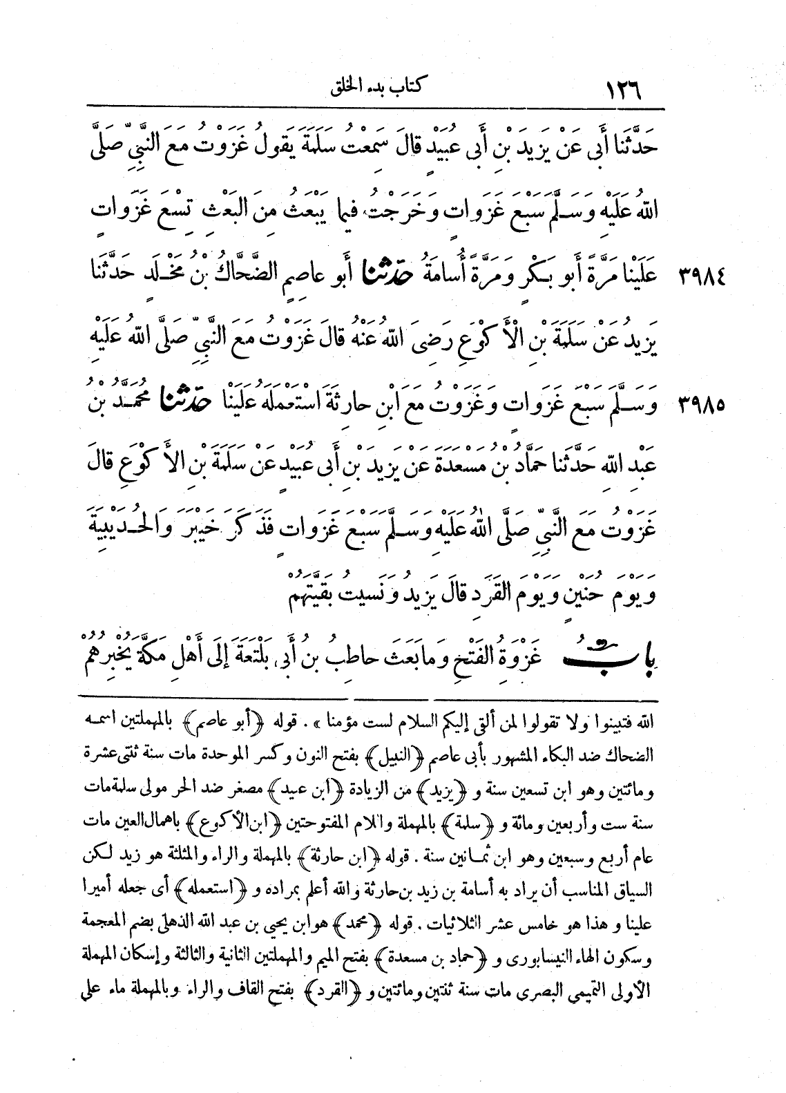 3984 - حَدَّثَنَا أَبُو عَاصِمٍ الضَّحَّاكُ بْنُ مَخْلَدٍ حَدَّثَنَا يَزِيدُ عَنْ سَلَمَةَ بْنِ الأَكْوَعِ - رضى الله عنه - قَالَ غَزَوْتُ مَعَ النَّبِىِّ صلى الله عليه وسلّم سَبْعَ غَزَوَاتٍ، وَغَزَوْتُ مَعَ ابْنِ حَارِثَةَ اسْتَعْمَلَهُ عَلَيْنَا.