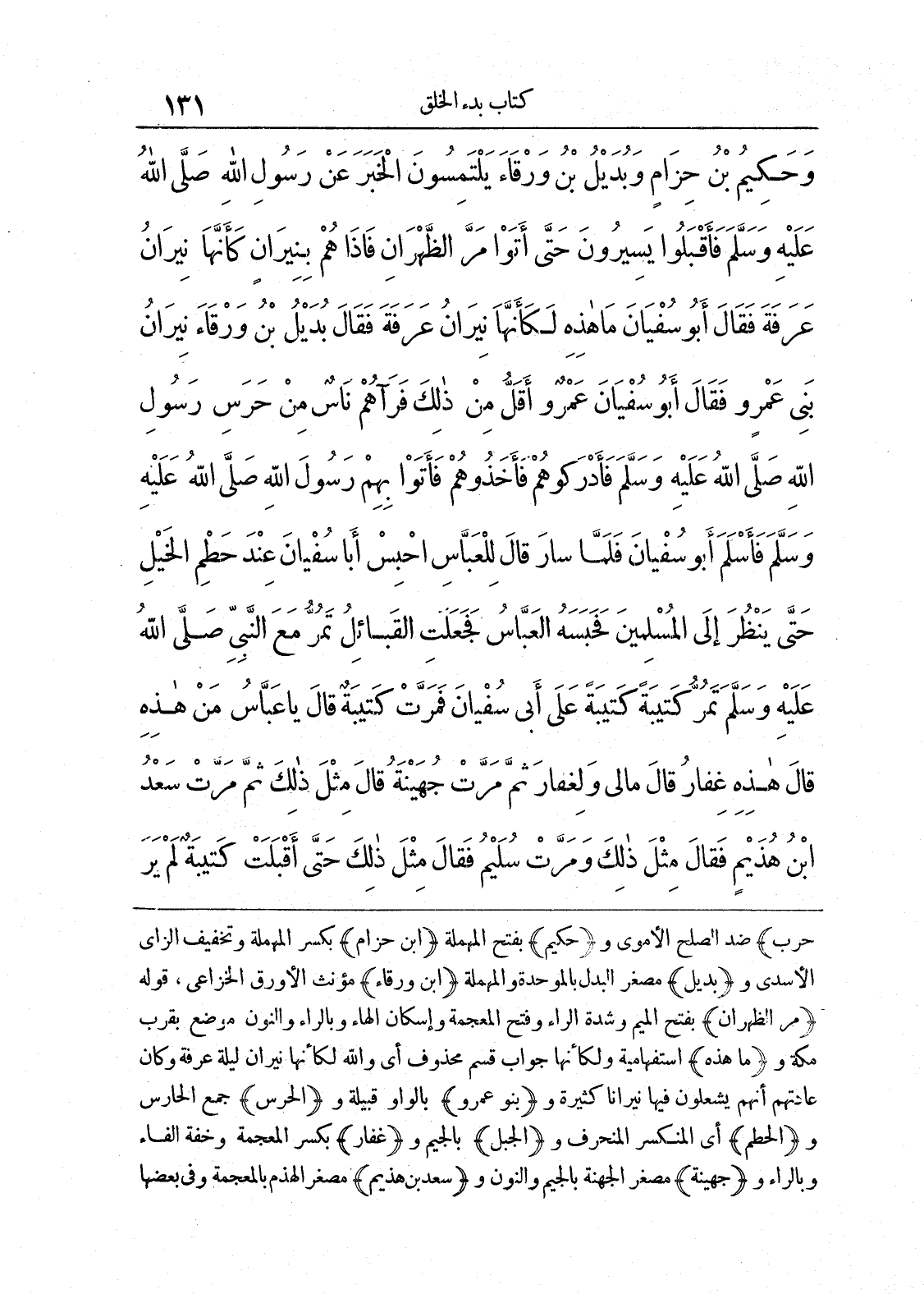 حرب (ضد الصلح الأموي و) حكيم (بفتح المهملة) ابن حزام (بكسر المهملة وتخفيف الزاي الاسدي و) بديل (مصغر البدل بالموحدة والمهملة) ابن ورقاء (الاورق الخزاعي، قوله) مر الظهران (بفتح الميم وشدة الراء وفتح المعجمة وإسكان الهاء وبالراء والنون موضع بقرب مكة وما هذه (استفهامية ولكانها جواب قسم محذوف أي والله لكانها نيران ليلة عرفة وكان عادتهم يشعلون فيها نيرانا كثيرة و) بنو عمرو (بالواو قبيلة والحرس (جمع الحارس و) الحطم (أي المنكسر المنحرف و) الجبل (بالجيم و) غفار (بكسر المعجمة وخفة الفاء وبالراء جهينة (مصغر الجهنة بالجيم والنون و) سعد بن هذيم (مصغر الهذم بالمعجمة وفي بعضها