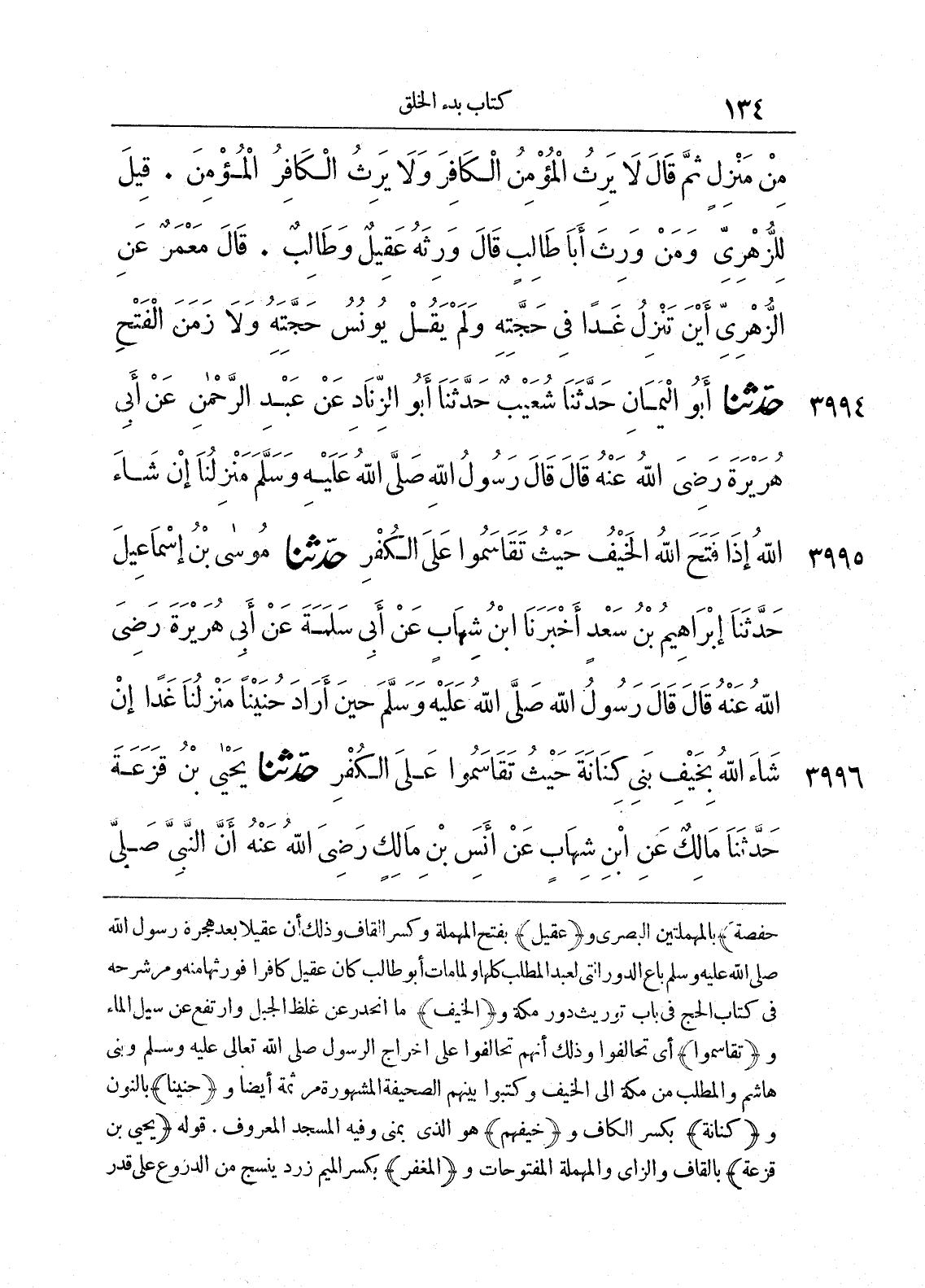 3995 - حَدَّثَنَا مُوسَى بْنُ إِسْمَاعِيلَ حَدَّثَنَا إِبْرَاهِيمُ بْنُ سَعْدٍ أَخْبَرَنَا ابْنُ شِهَابٍ عَنْ أَبِى سَلَمَةَ عَنْ أَبِى هُرَيْرَةَ - رضى الله عنه - قَالَ قَالَ رَسُولُ اللَّهِ صلى الله عليه وسلّم حِينَ أَرَادَ حُنَيْناً «مَنْزِلُنَا غَداً إِنْ شَاءَ اللَّهُ بِخَيْفِ بَنِى كِنَانَةَ، حَيْثُ تَقَاسَمُوا عَلَى الْكُفْرِ».