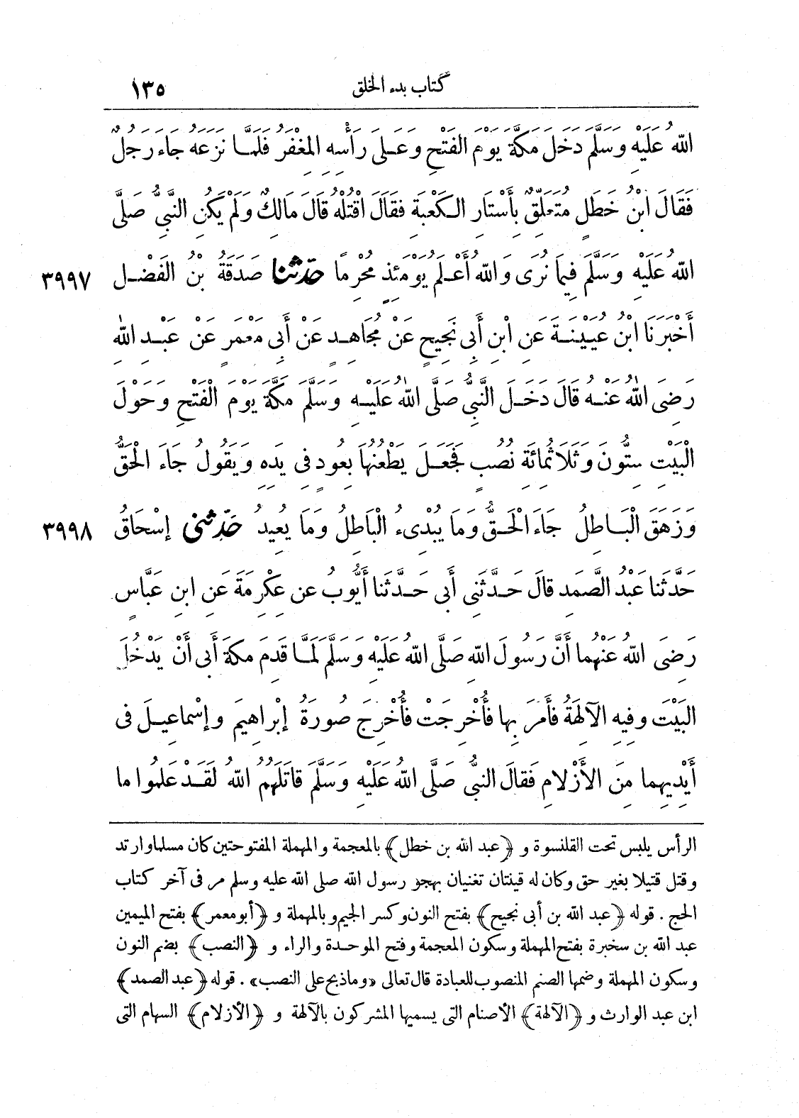 3997 - حَدَّثَنَا صَدَقَةُ بْنُ الْفَضْلِ أَخْبَرَنَا ابْنُ عُيَيْنَةَ عَنِ ابْنِ أَبِى نَجِيحٍ عَنْ مُجَاهِدٍ عَنْ أَبِى مَعْمَرٍ عَنْ عَبْدِ اللَّهِ - رضى الله عنه - قَالَ دَخَلَ النَّبِىُّ صلى الله عليه وسلّم مَكَّةَ يَوْمَ الْفَتْحِ وَحَوْلَ الْبَيْتِ سِتُّونَ وَثَلاَثُمِائَةِ نُصُبٍ، فَجَعَلَ يَطْعُنُهَا بِعُودٍ فِى يَدِهِ وَيَقُولُ «جَاءَ الْحَقُّ وَزَهَقَ الْبَاطِلُ، جَاءَ الْحَقُّ، وَمَا يُبْدِئُ الْبَاطِلُ وَمَا يُعِيدُ».